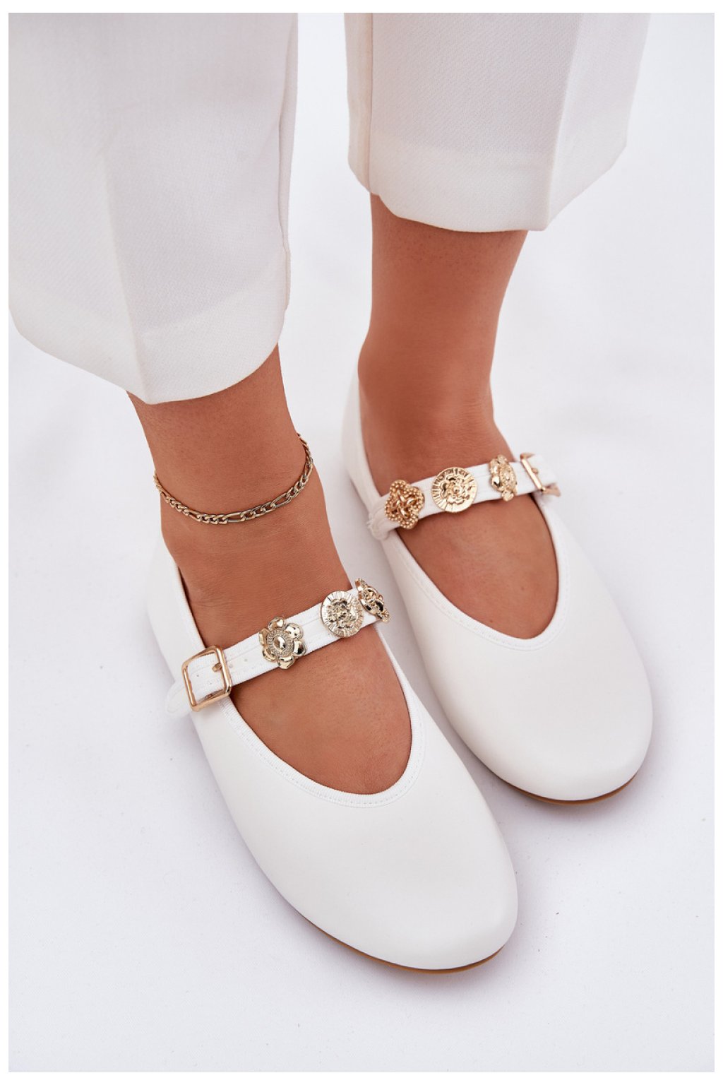 Baleríny dámské z ekokože jsou elegantní nabídkou na každý den. Díky zaobleným špičkám poskytují pohodlí a pásek na nártu s zlatými ozdobami jim dodává subtilní, stylový akcent. Ideální pro různé stylizace, spojují pohodlí s módním vzhledem a jsou skvělou volbou na letní dny.