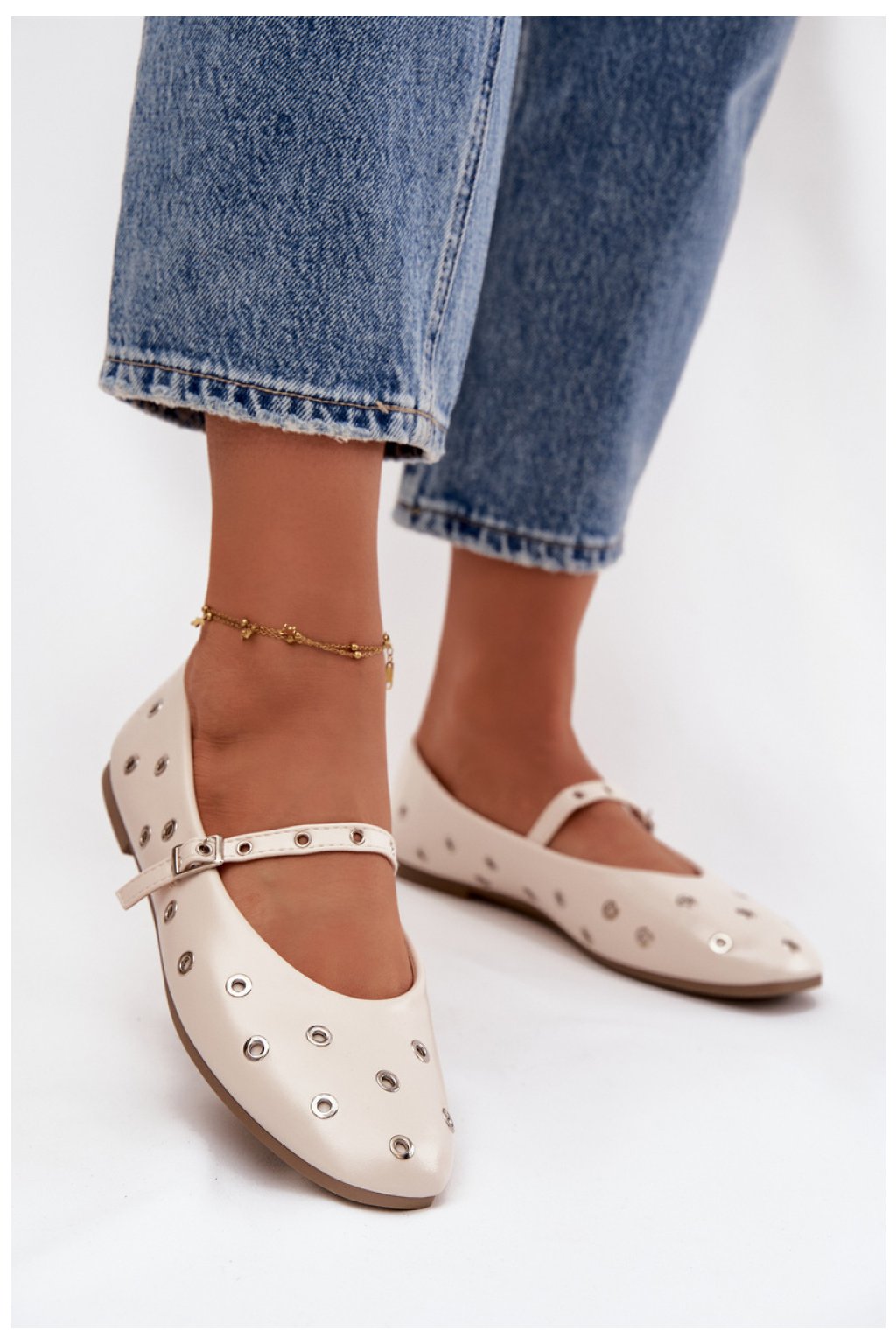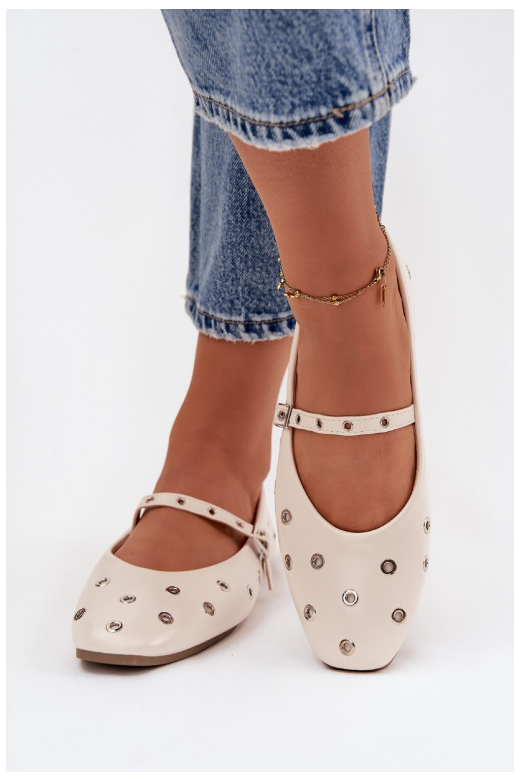 Baleríny pro dámy vyrobené z ekokože. S plochým podpatkem zaručují pohodlí i při dlouhodobém nošení. Na nártu mají nastavitelný pásek s přezkou, který umožňuje ideální přizpůsobení noze a dodává celku stylový charakter. Model vyniká ozdobnými prvky ve formě koleček, které mu dodávají módní a originální vzhled. Jsou to univerzální baleríny, které se skvěle hodí do každodenních outfitů jak k kalhotám, tak k šatům nebo sukni.