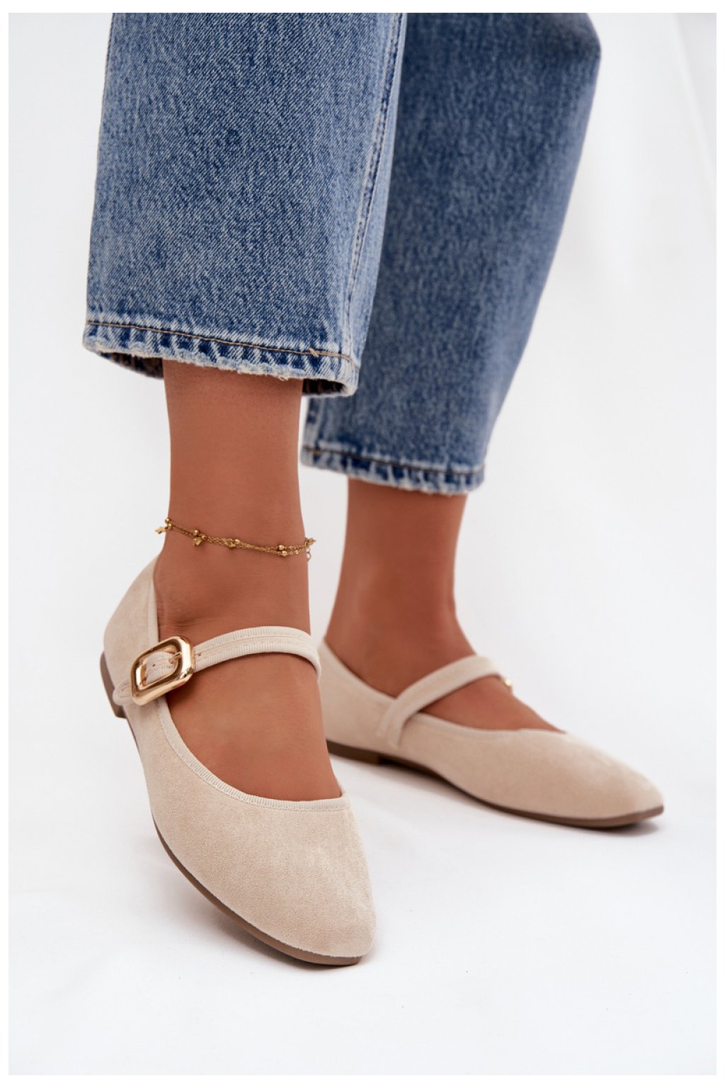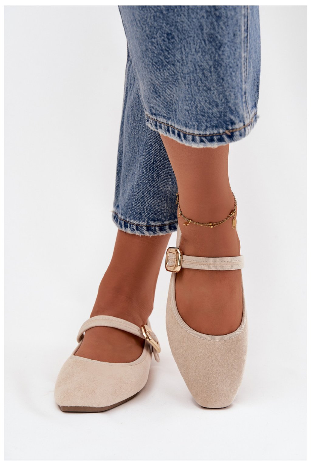 Baleríny pro ženy vyrobené z měkkého ekologického semiše. Model s nízkým podpatkem zaručuje pohodlí po celý den a jemně zaoblené špičky dodávají celku jemný ženský charakter. Na nártu je pásek s zlatou přezkou, který přitahuje pozornost a dodává elegantní dokončení. Měkká stélka zajišťuje pohodlí během chůze. Jedná se o klasické a zároveň stylové baleríny, které se hodí do mnoha stylizací od každodenních po elegantnější. Ideální do práce, na schůzky nebo pro procházky.