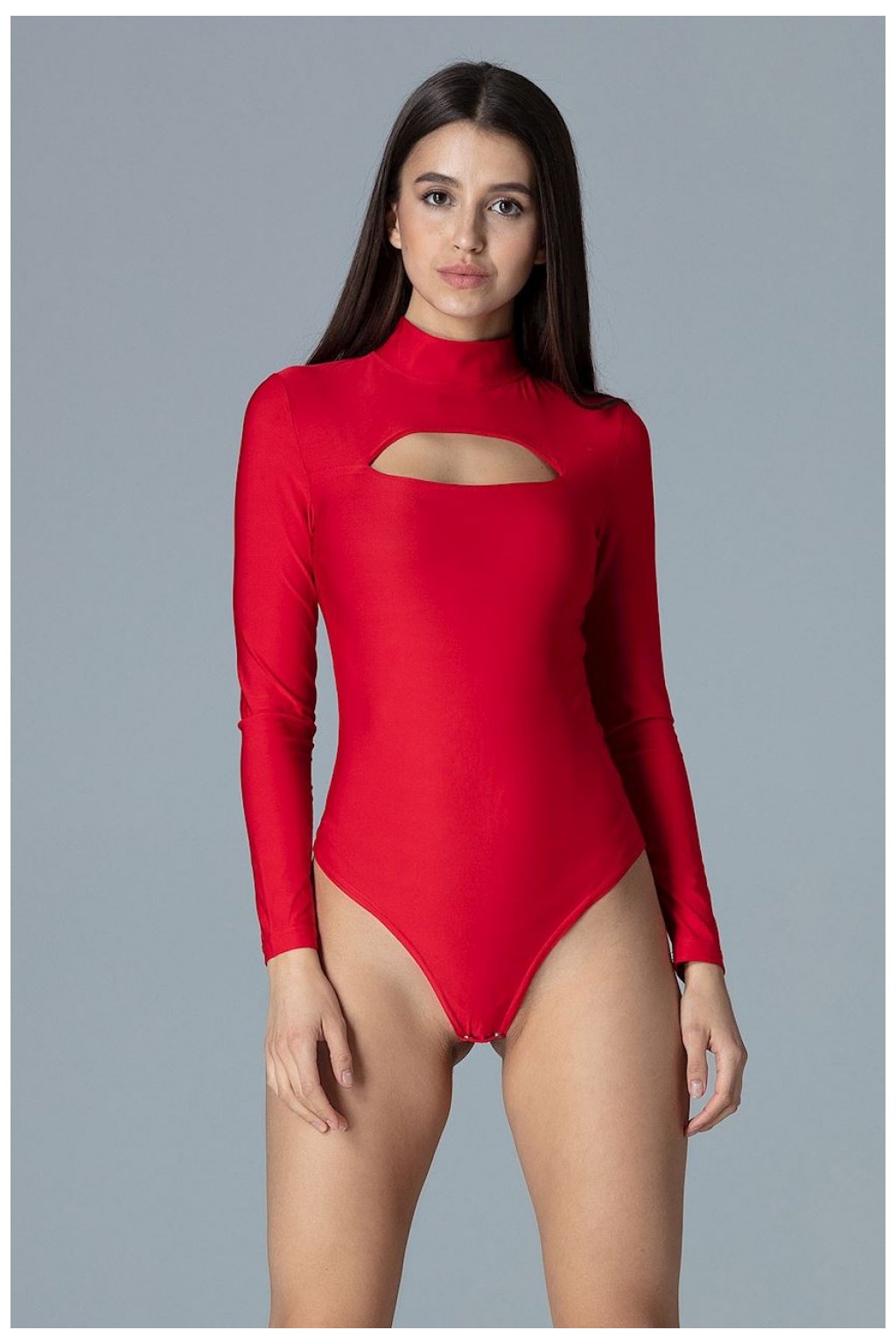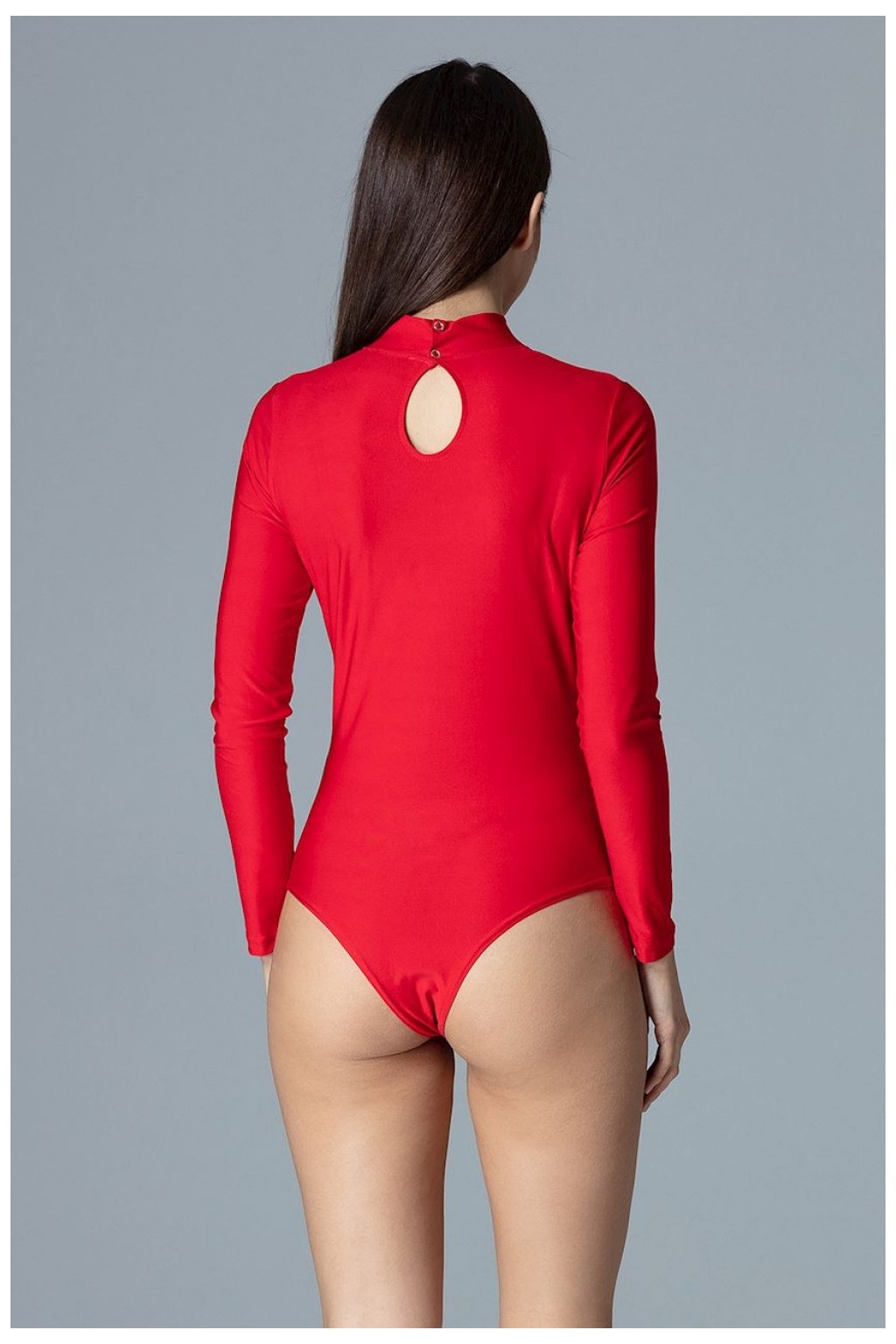 Body s dlouhými rukávy z elastické tkaniny krásně tvaruje postavu. Top má stojáček s ozdobnou slzou nad prsy a zapínání na pruženku na zádech.