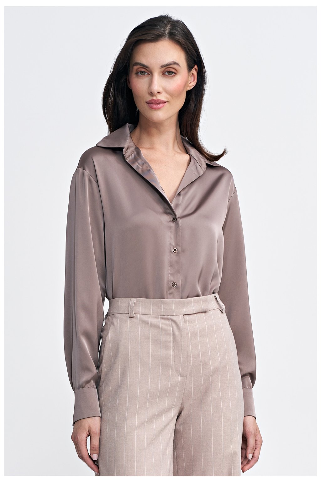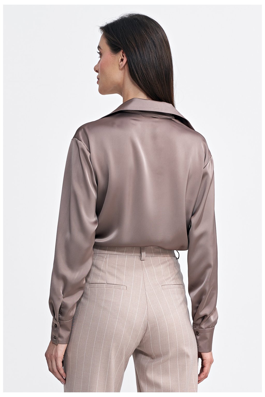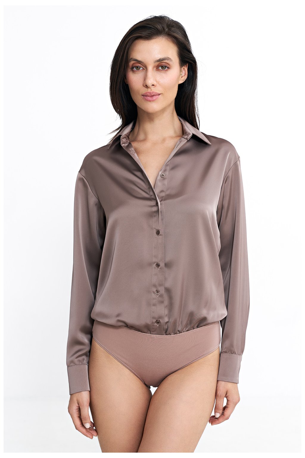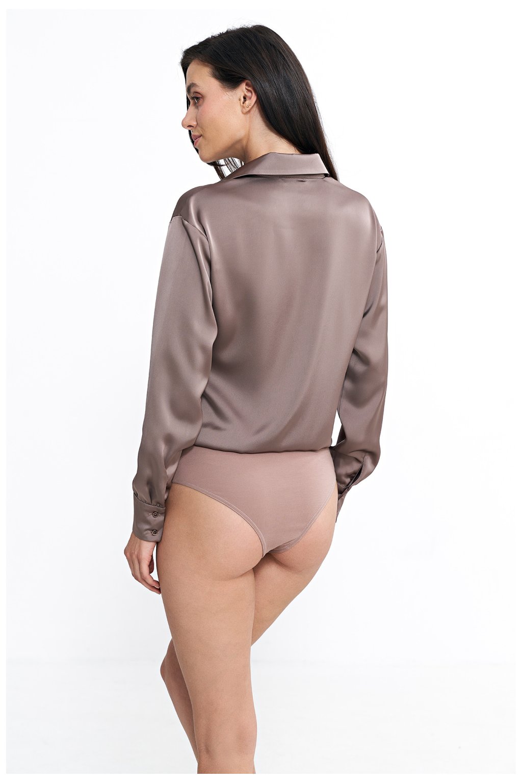 Tělo s pravidelným střihem vyrobené z materiálu s saténovým efektem, který dodává eleganci a jemný lesk. Má klasický límec a dlouhé rukávy s manžetami, co dodává celku nadčasový styl. Zapínání předními knoflíky a suchými zipy v rozkroku zajišťují pohodlí a snadné nošení. Dolní část, tedy kalhotky, jsou vyrobeny z elastického materiálu, co zaručuje ideální přizpůsobení siluetě a pohodlí po celý den. Toto tělo kombinuje klasický design s moderním dokončením, vytvářející univerzální kus šatníku.