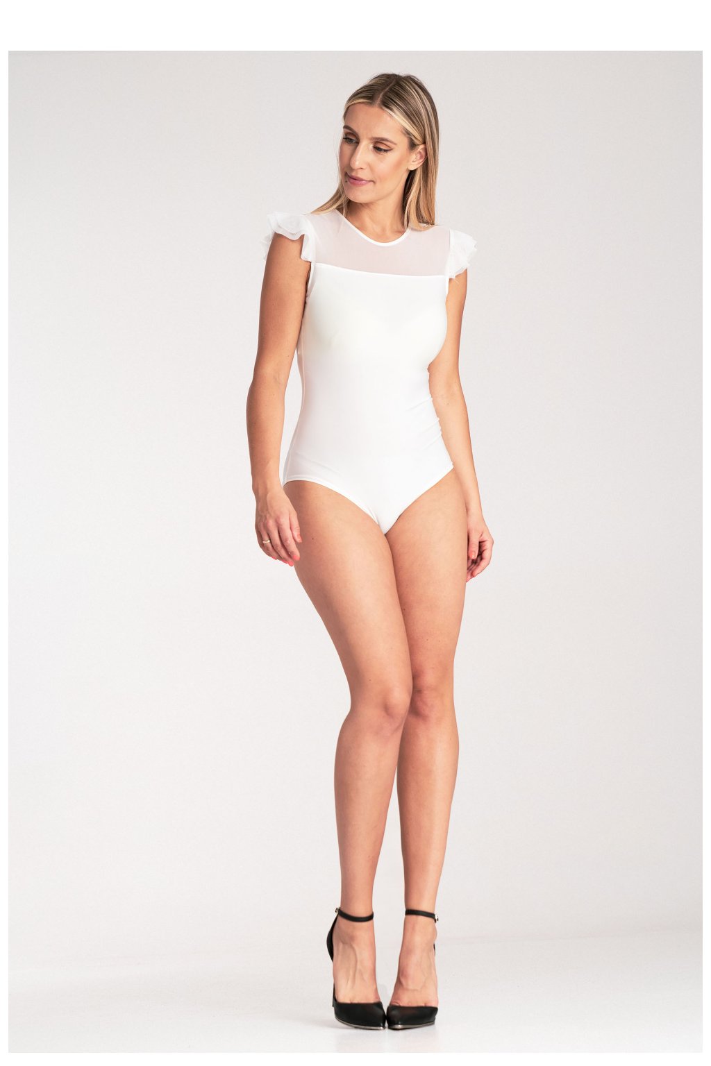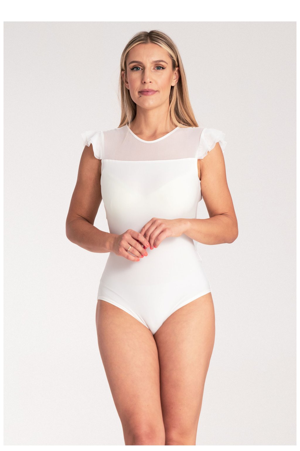 Elegantní body s krátkými rukávy lemovanými volánkem. Výstřih z průhledné síťoviny.