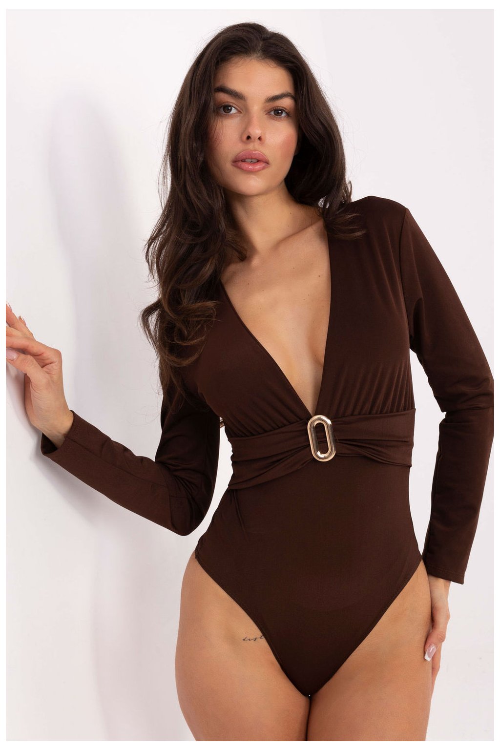 Elegantní a ženské body s kovovou ozdobou vpředu jsou spojením elegance a pohodlí v moderním provedení. Vyrobené z vysokokvalitní směsi polyesteru, viskózy a elastanu, skvěle padnou k postavě, zdůrazňují její tvary a zajišťují pohodlí při nošení. Model vyniká hladkým materiálem s jemným leskem a výstřihem do V, který krásně zdůrazňuje krk a dodává celku smyslný charakter. Kovová ozdoba vpředu je elegantním akcentem, díky kterému se body skvěle hodí jak do společenských stylizací, tak do práce nebo na večerní vycházku. Body má dlouhý rukáv a zapínání na háčky, co zaručuje pohodlí při nošení a perfektní přizpůsobení. Standardní délka zajišťuje, že se skvěle hodí k sukní nebo elegantním kalhotám s vysokým pasem.