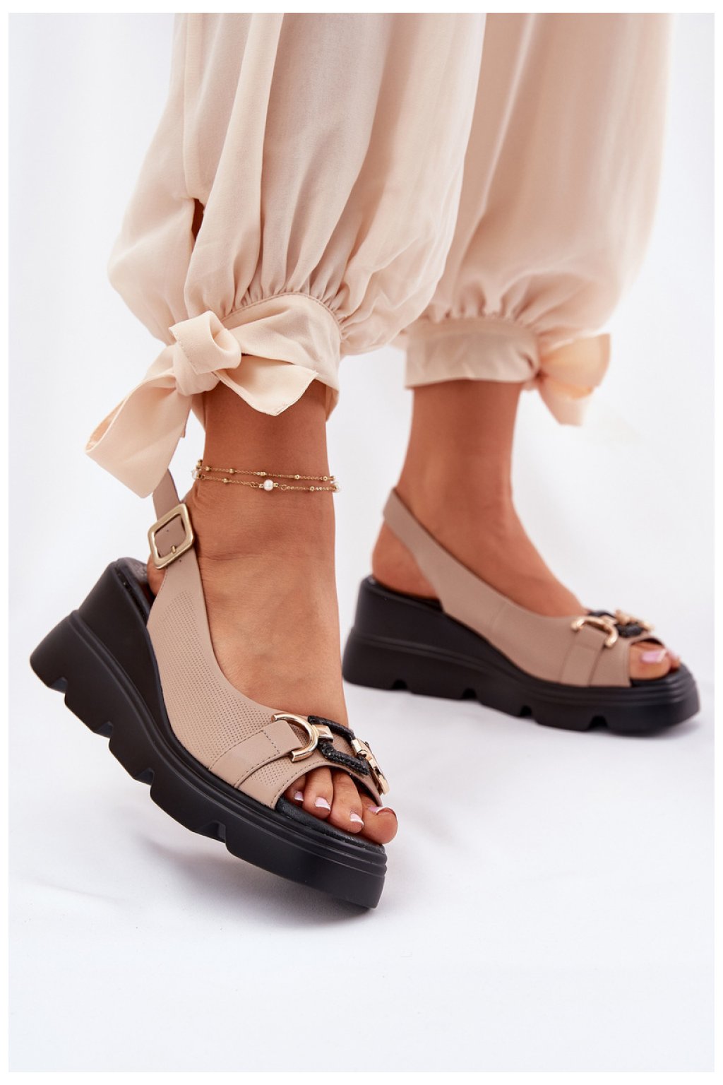 Dámské sandály vyrobené z vysoce kvalitní přírodní kůže jsou kombinací elegance a pohodlí. Umístěné na platformě a klínu, zajišťují pohodlí a stabilitu po celý den. Vpředu se nachází jemný ozdobný prvek, který jim dodává výjimečný charakter. Měkká stélka zaručuje pohodlí při nošení a zapínání na sponu s nastavitelným páskem umožňuje dokonalé přizpůsobení noze. Tyto sandály jsou vynikající volbou pro letní stylizace, ideální na různé příležitosti.