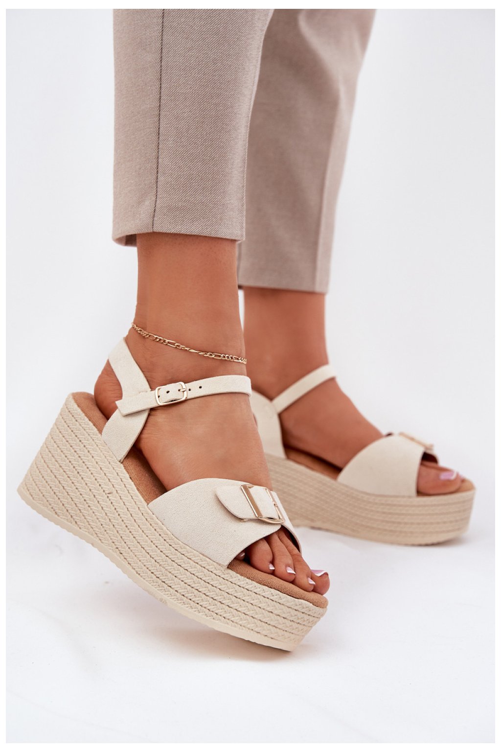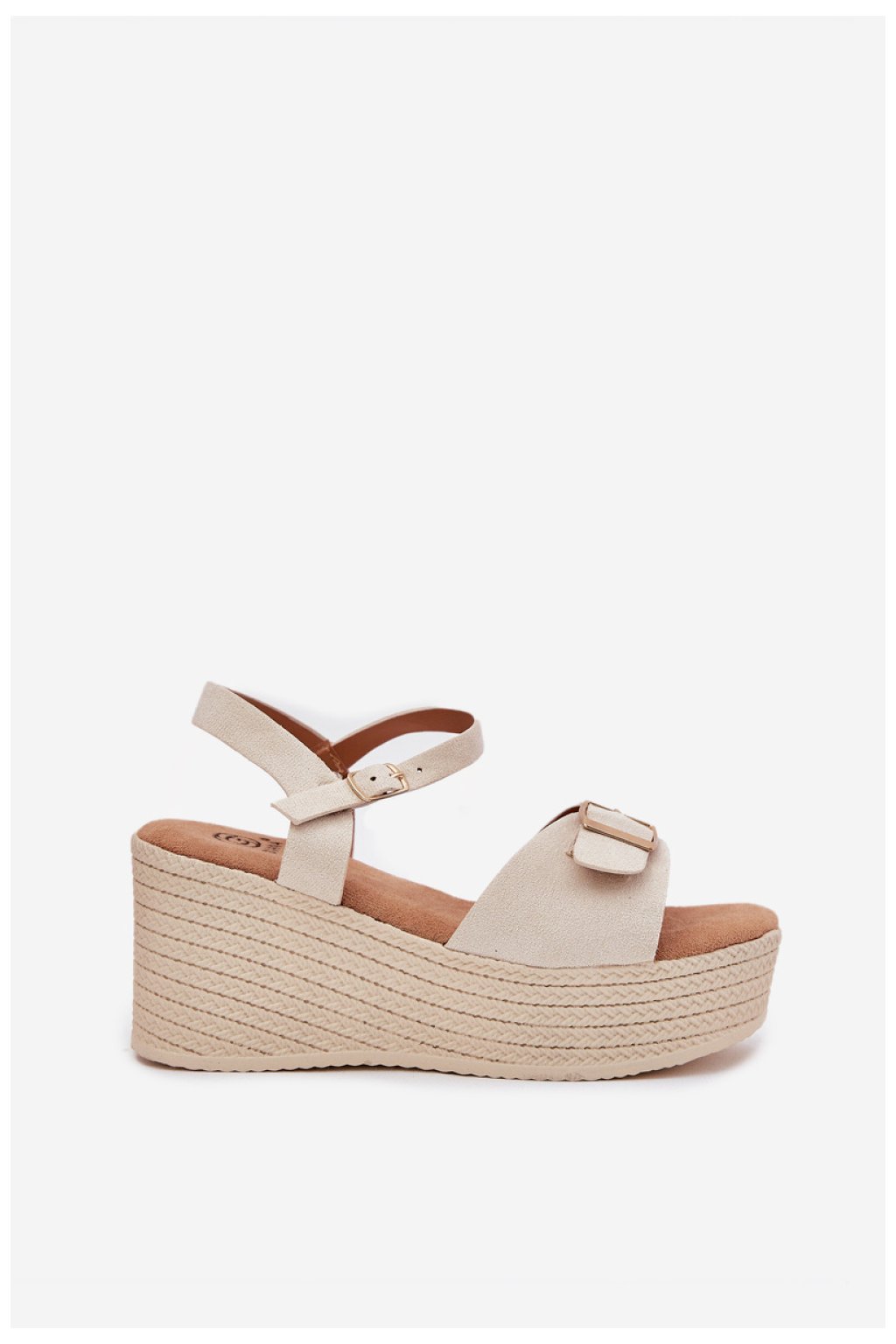 Dámské sandály vyrobené z ekosuede. Umístěné na klínu a platformě s imitací pleteného vzoru, poskytují pohodlí a stabilitu po celý den. Vepředu je ozdobná spona, která jim dodává jedinečný charakter. Model se zapíná na přezku umožňující ideální přizpůsobení noze, a měkká vložka zaručuje pohodlí. Tyto sandály budou skvělým doplňkem letního outfitu.