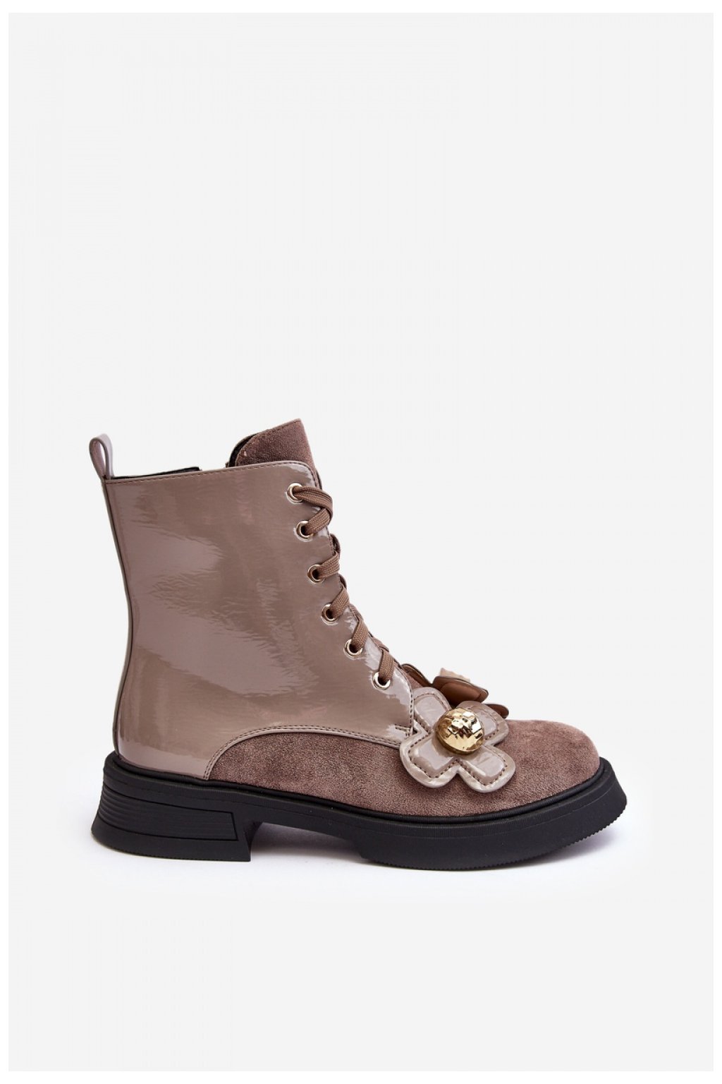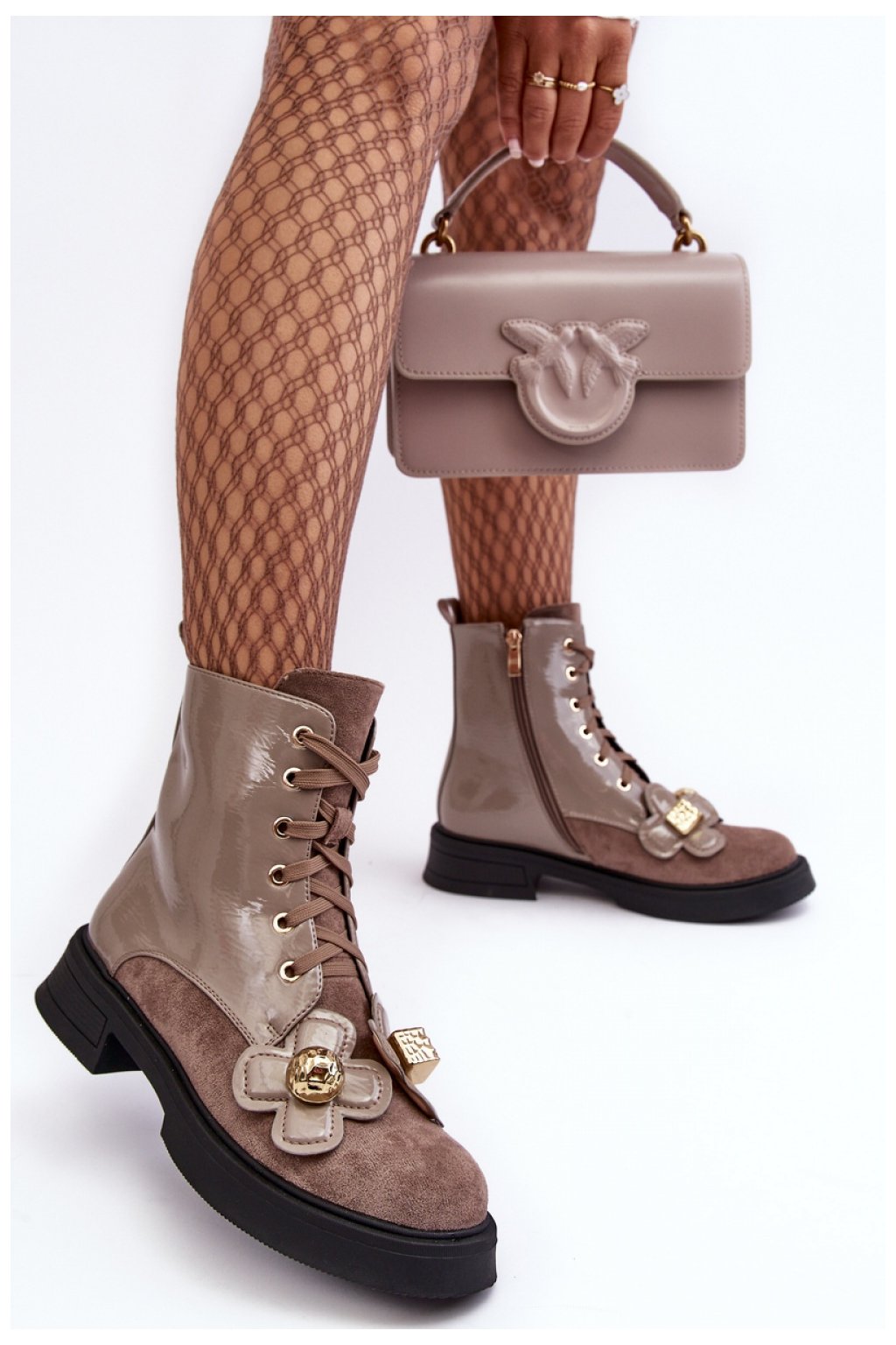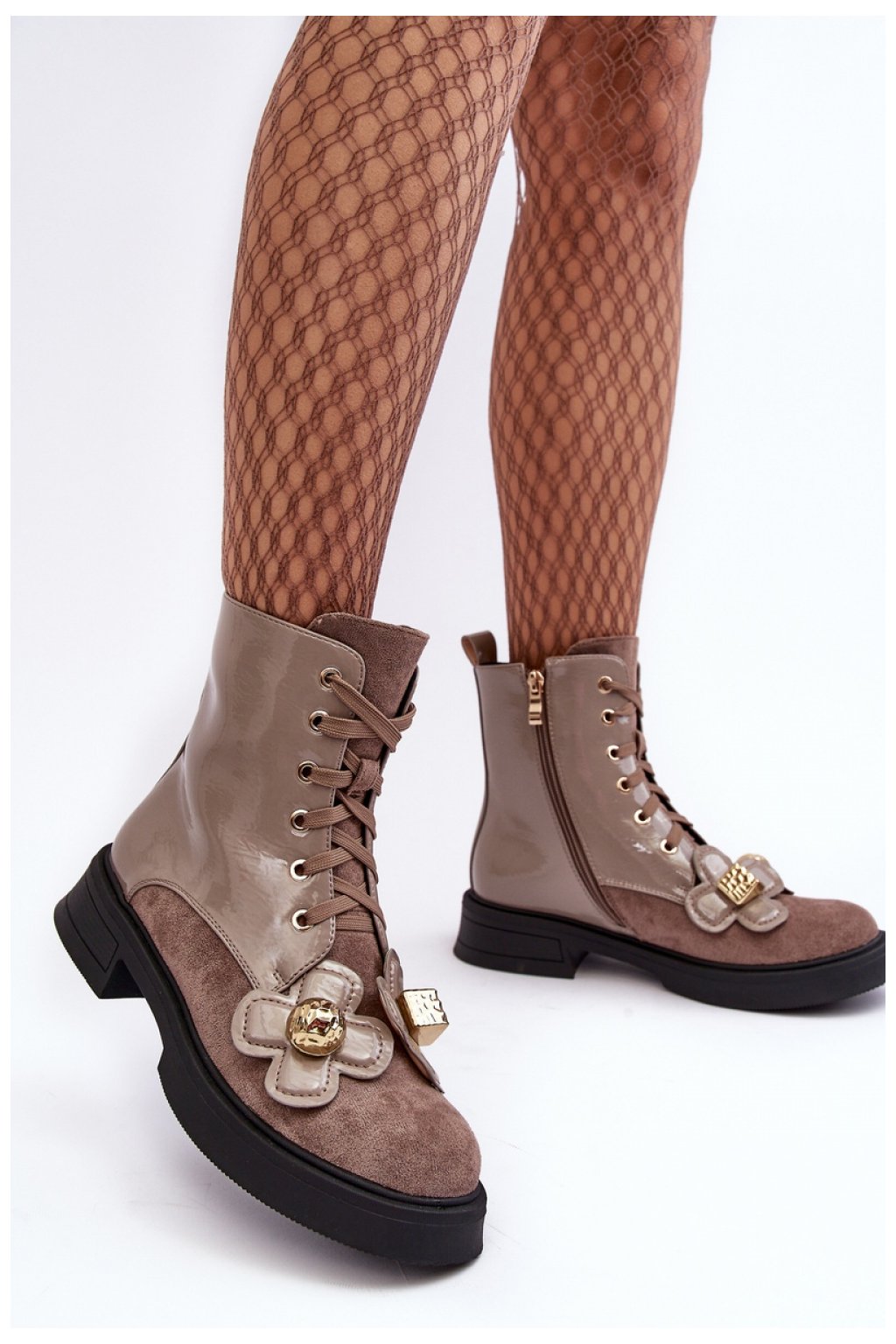 Dámské boty byly vyrobeny z vysoce kvalitní ekologické kůže. Jsou posazeny na plochém podpatku a platformě. Mají systém šněrování na přední straně a zip na boku svršku pro snadné nazouvání. Vnitřní strana je zateplená dekou příjemnou na dotek. Kromě toho je tento model zdoben látkou a plastovými květy. Tento model jistě využijete v mnoha outfitech!