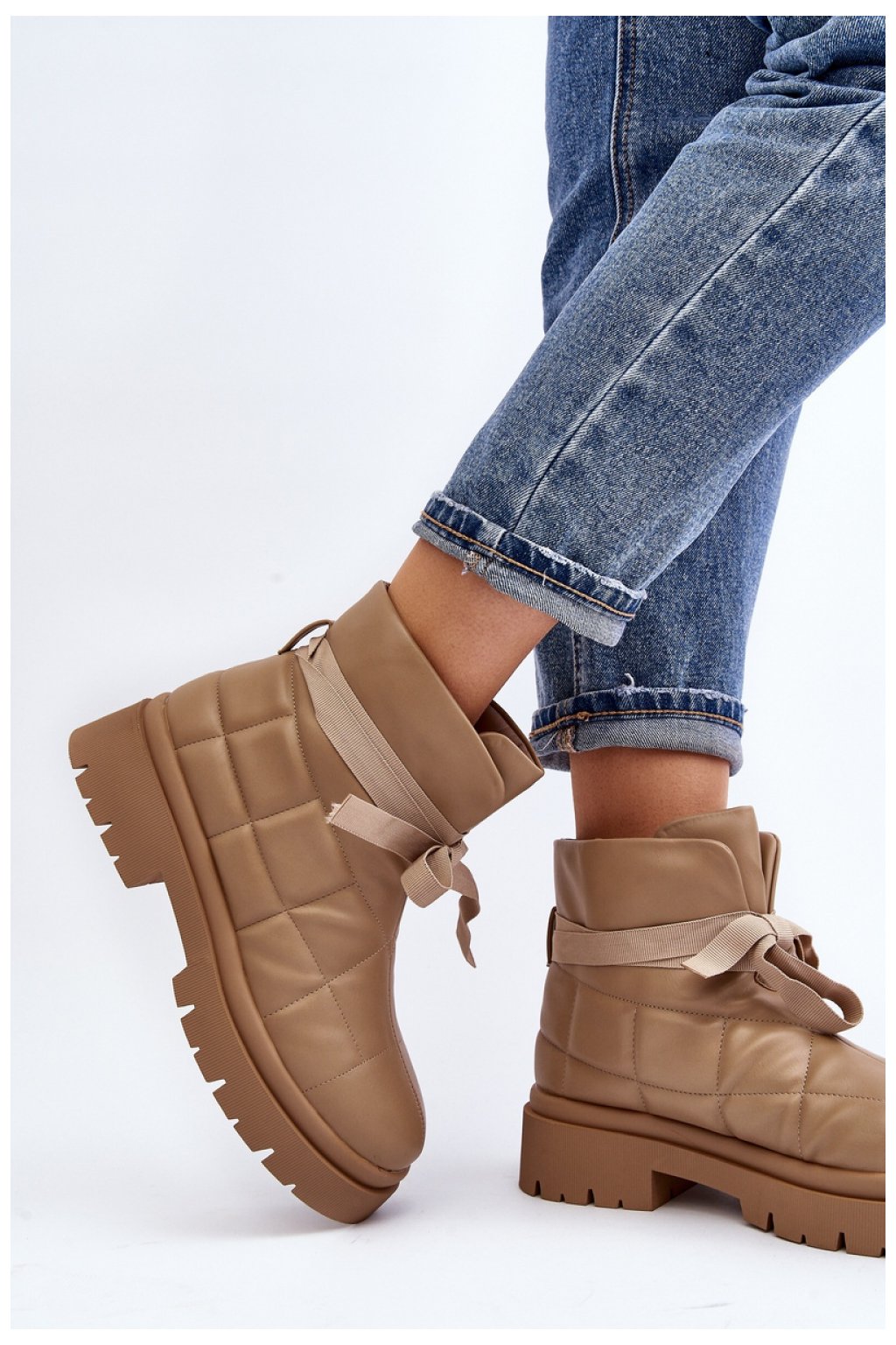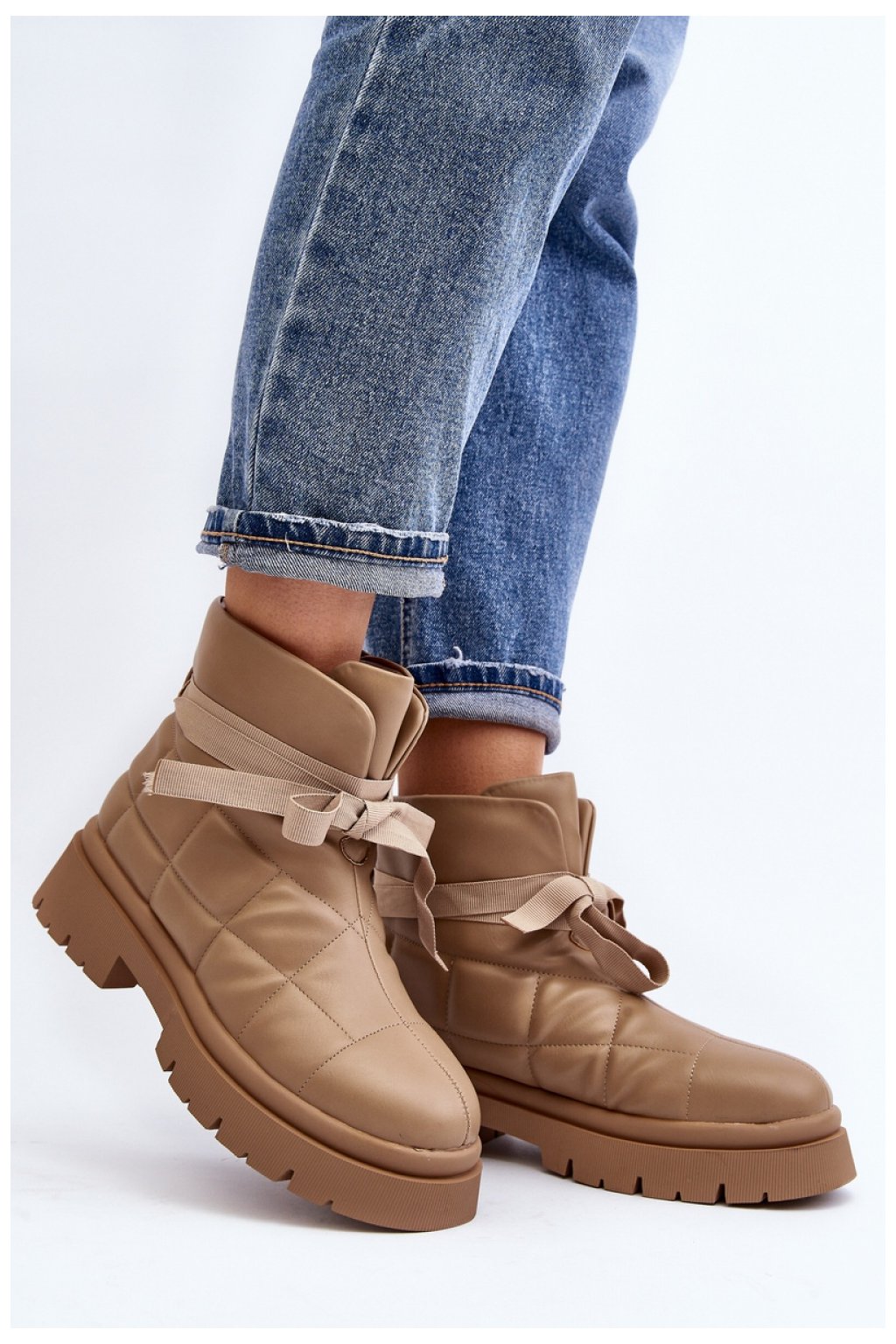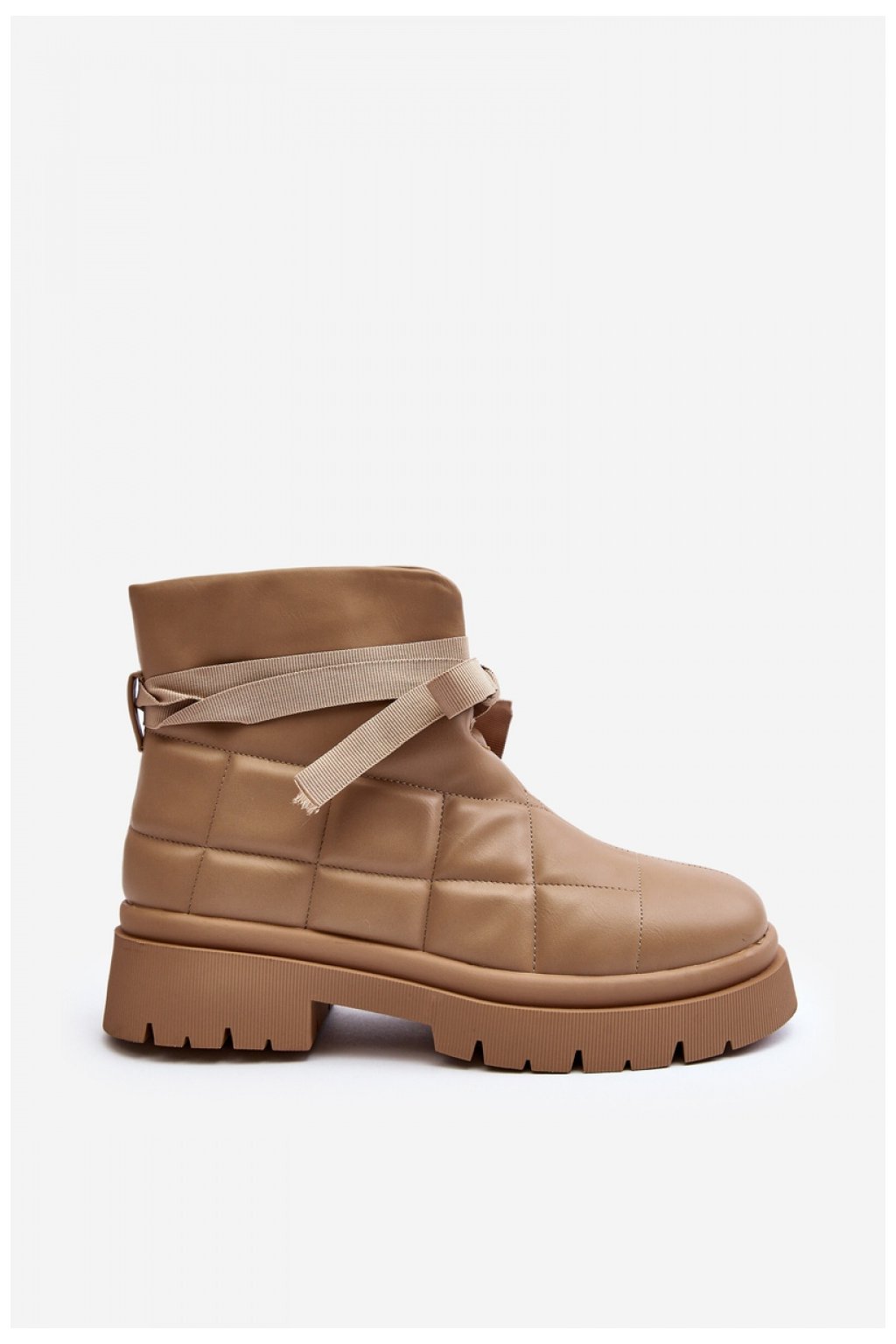 Teplé a módní boty z ekologické kůže. Stojí na plochém, stabilním podpatku. Nazouvací model se svrškem v délce nad kotníky. Uvnitř podšité kožešinou. Prošívaný svršek. Podpatek je rovněž zpevněný. Ideální pro chladné dny!