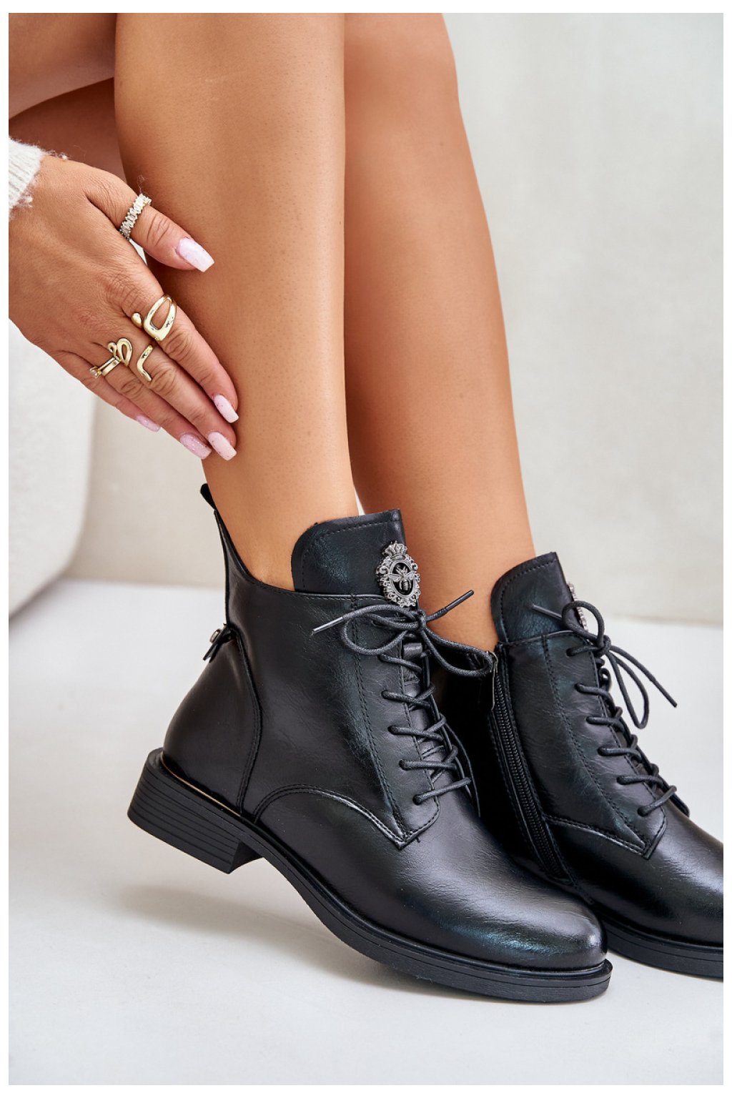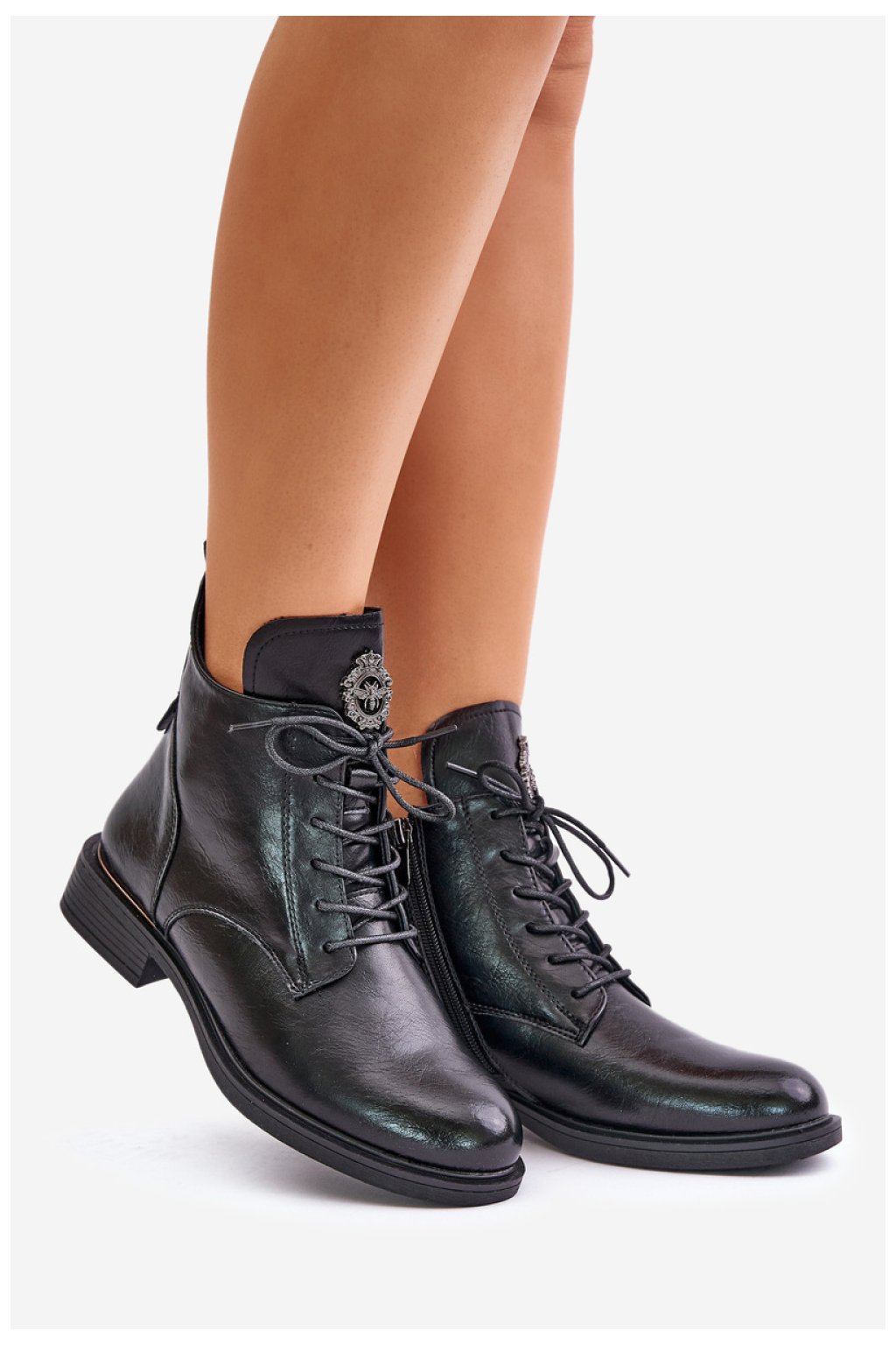 Boty z ekokůže jsou stylovou a pohodlnou obuví pro chladnější dny. Jsou usazeny na plochém podpatku a poskytují pohodlné nošení po celý den. Model má šněrování i zip, díky čemuž se snadno nazouvá a rychle obouvá. Vnitřek je zateplený přikrývkou na boty, která zajišťuje teplo. Detail na jazyku dodává botám originální nádech. Ideální pro každodenní ležérní styling.