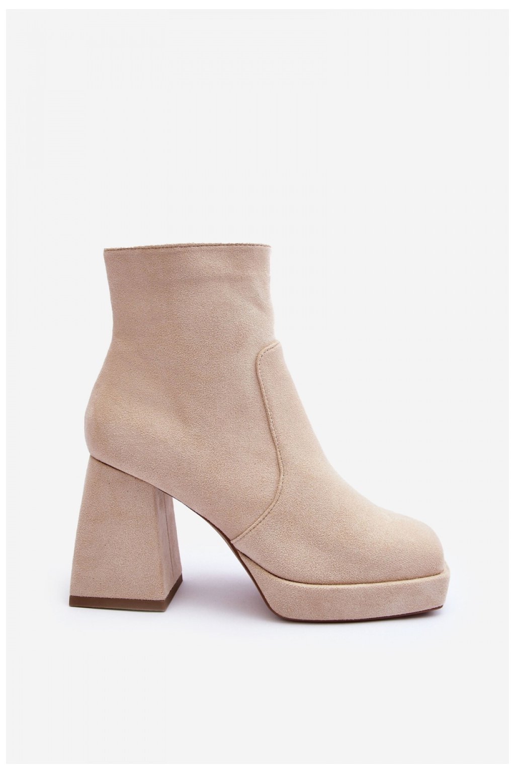 Dámské boty na masivním vysokém bloku a platformě. Vyrobené z ekokůže. Zapínání na zip na vnitřní straně svršku. Střed podšitý přikrývkou na boty. Čtvercová špička. Pultík na patě je vyztužený.