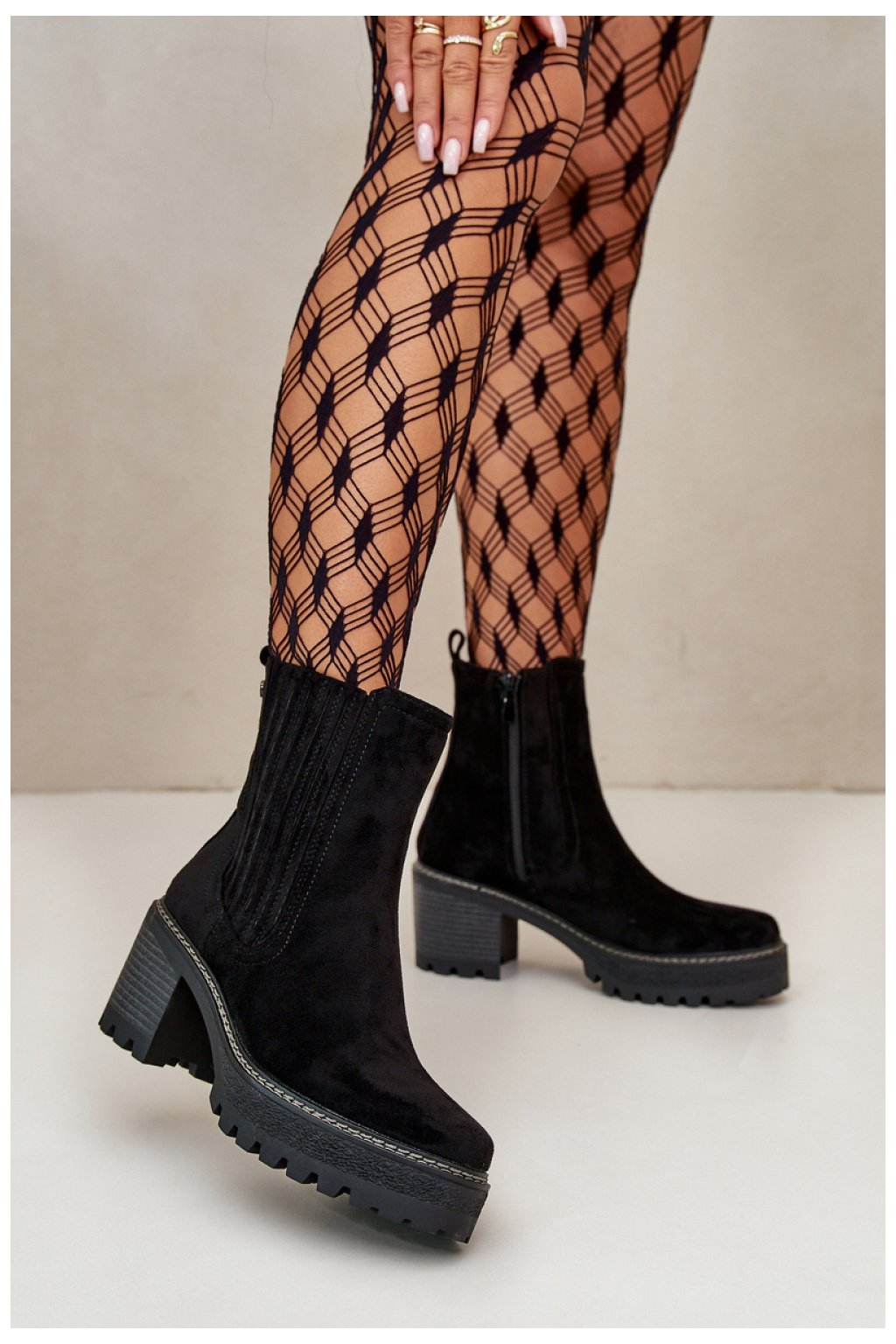 Dámské kotníkové boty vyrobené z ekologického semiše. Usazeny na stabilním sloupcovém podpatku. Uvnitř podšívka z obuškového polštáře, což poskytuje teplo a pohodlí při nošení. Tento model se zapíná na zip, co usnadňuje obutí a sundání. Konec boty je zaoblený. Ideální pro podzimní a zimní stylizace.
