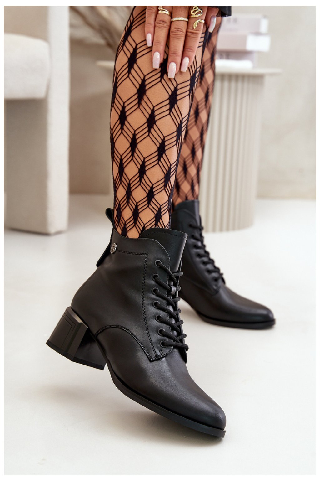 Dámské botky značky Vinceza. Vyrobeny z přírodní kůže. Umístěny na stabilní podpatku. Model se šněrováním a s dalším zipem. Zaoblené špičky. Vnitřek je vyložen kožešinou. Po stranách botky se nachází ozdobný malý detail.