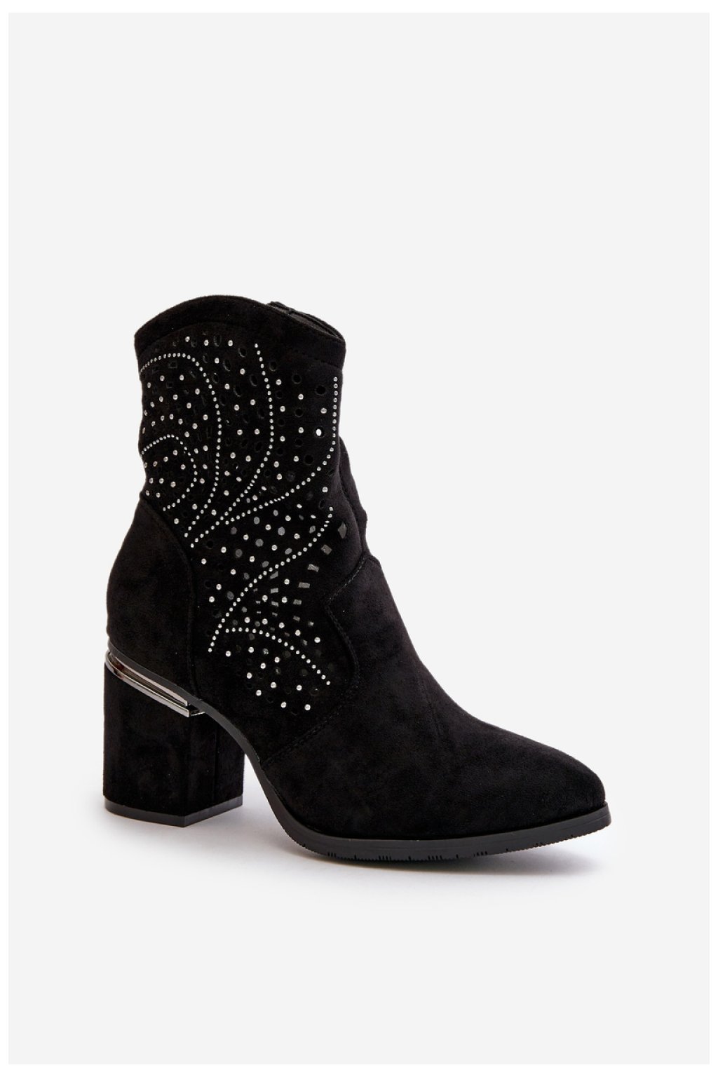 Elegantní ažurové dámské botky vyrobené z kvalitního ekologického semiše. Usazené na stabilním sloupkovém podpatku. Špičaté nosky. Model se zapíná na zip, což zajišťuje pohodlí a snadné obutí. Ideální na různé příležitosti, tyto boty budou stylovým doplňkem vašeho šatníku.