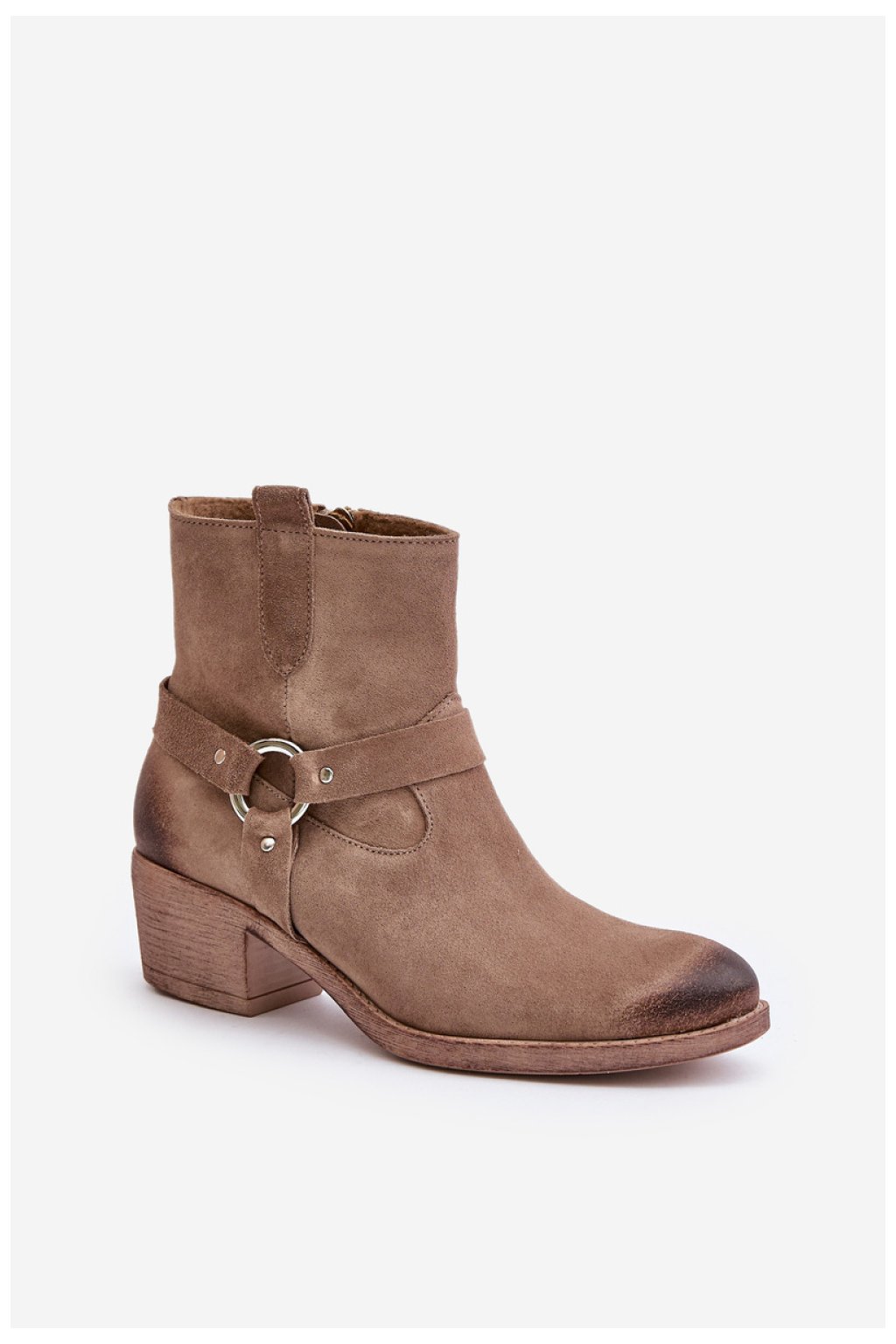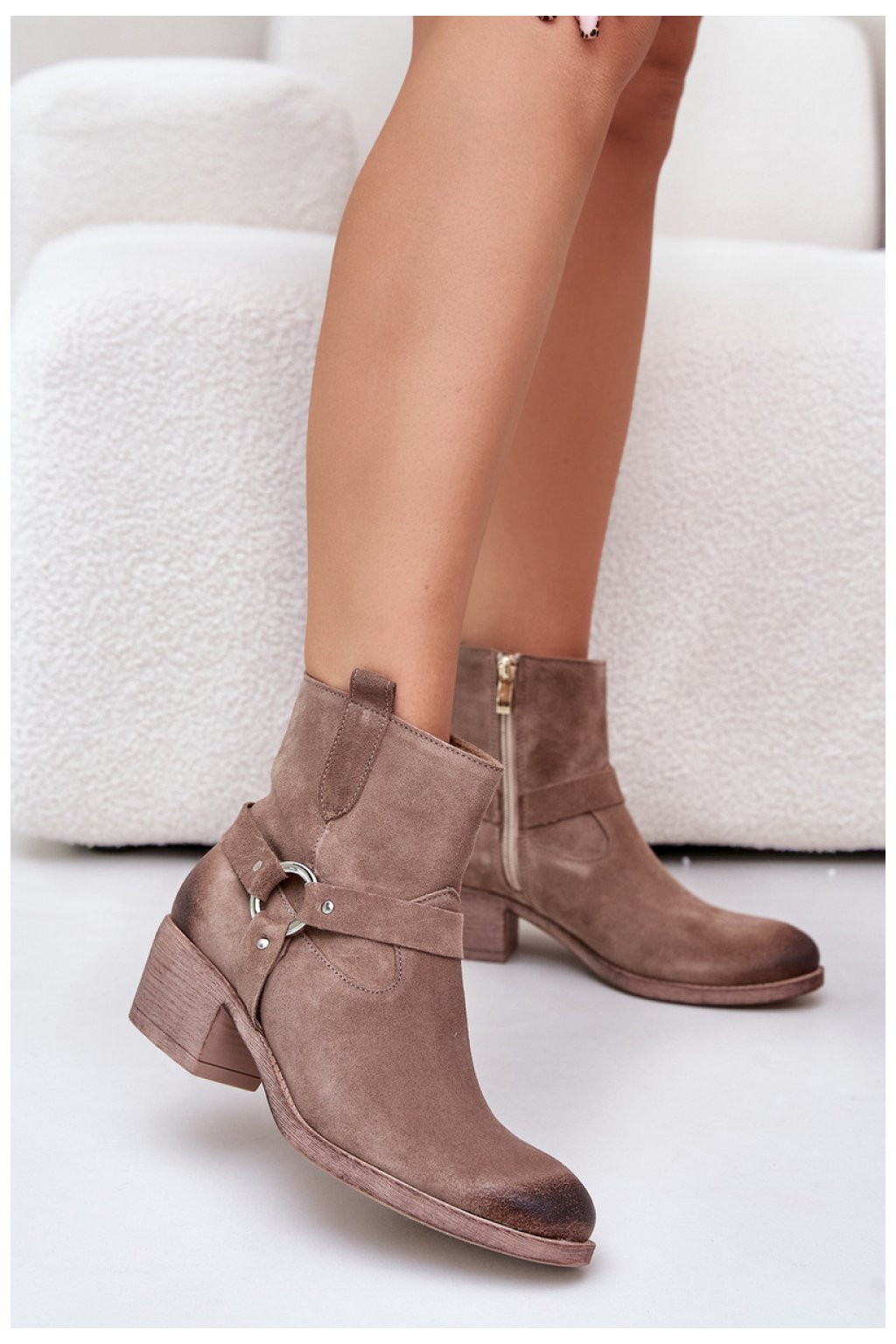 Dámské boty z přírodního semiše. Stojí na nízkém podpatku. Mandlový tvar špičky. Uvnitř plsť, která udrží teplo v chladnějších dnech. Zapínání na zip. Pruhy na svršku. Tento model se bude skvěle hodit ke kalhotám i šatům.