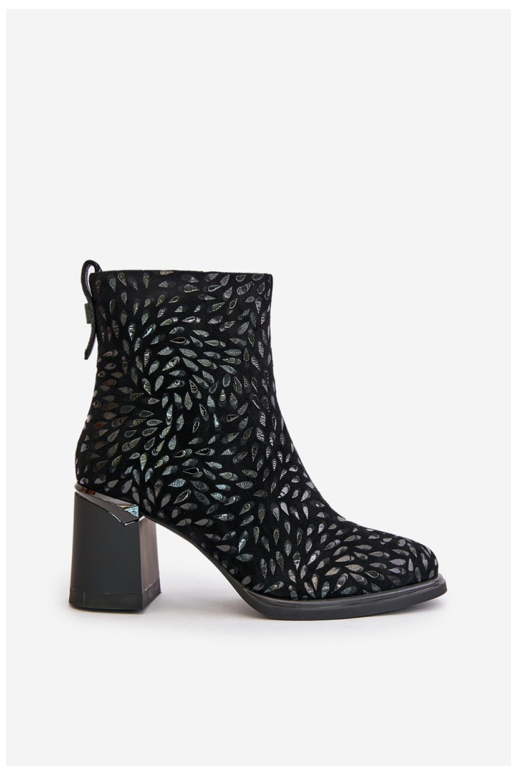 Elegantní dámské boty z přírodního semiše. Osazené na podpatku ve tvaru sloupku. Hlavní předností tohoto modelu jsou četné reliéfy na svršku. Zaoblená špička. Zapínání na zip. Zateplený vnitřek s přikrývkou na boty pro teplo a pohodlí v chladnějších dnech.