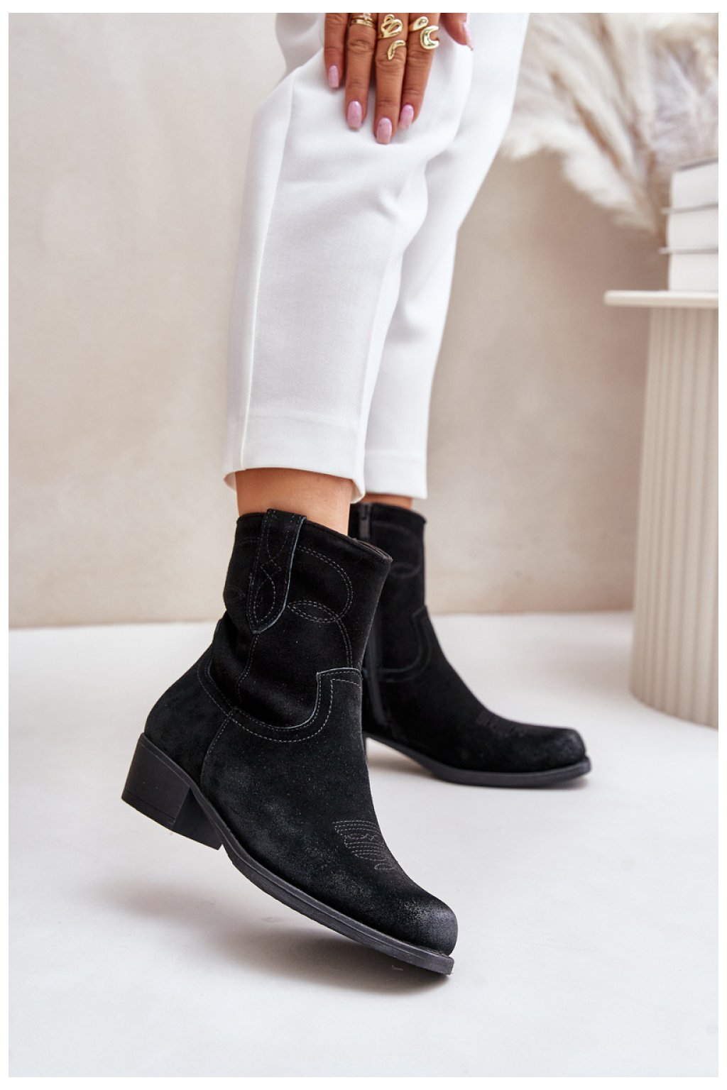 Dámské boty v kovbojském stylu. Vyrobené z přírodního semiše. Osazeny na nízkém podpatku, který zajistí stabilitu při každém kroku. Tento model se vyznačuje hranatou špičkou a prošíváním na svršku. Zapínání na zip. Zateplené dekou příjemnou na dotek, která boty udrží v teple v chladnějších dnech. Mimořádně módní střih, který byste měli mít ve svém podzimně-zimním šatníku!