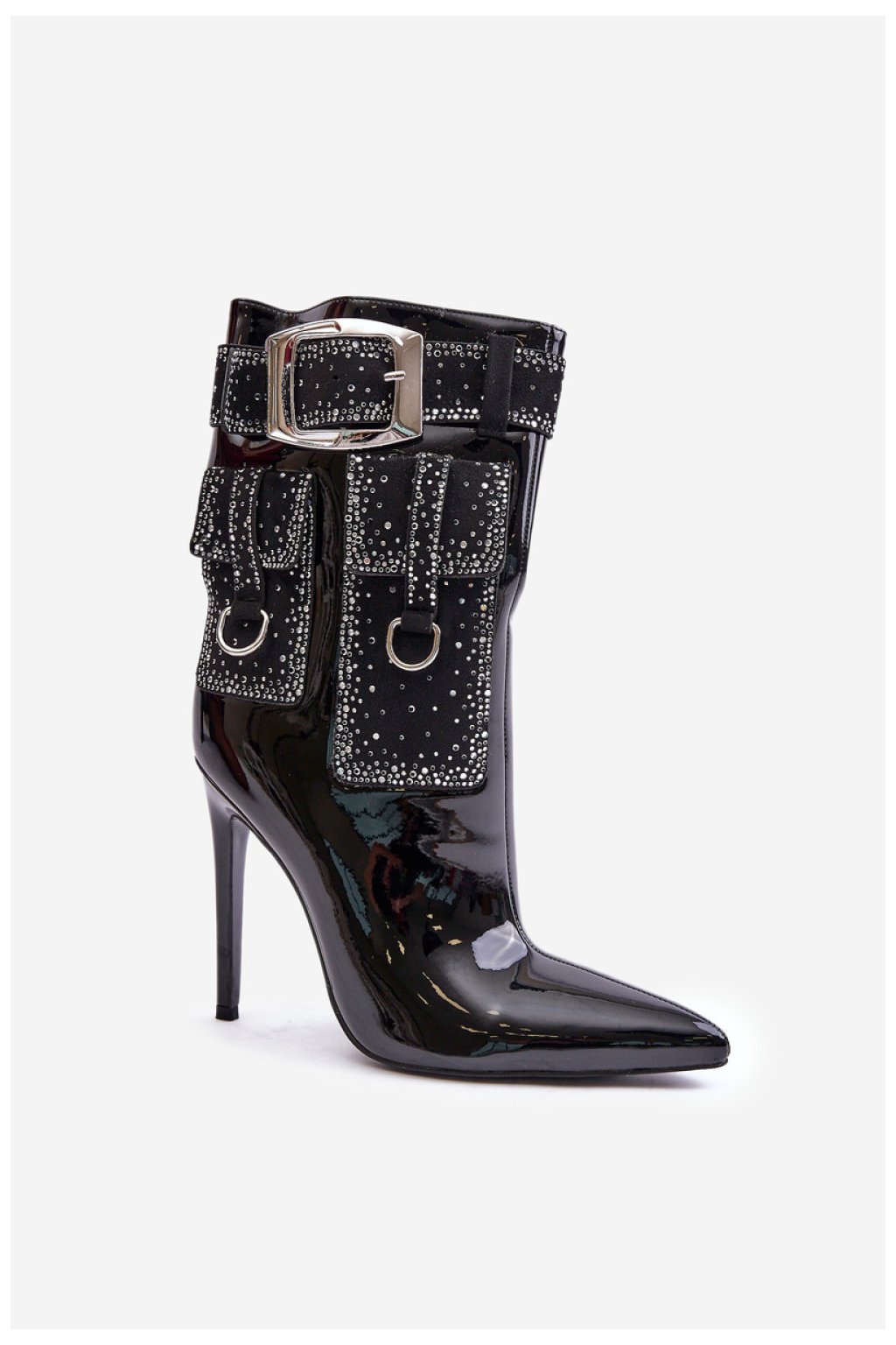 Unikátní kotníčkové boty na podpatku vyrobené z lakové ekokože, které přitahují pohled elegantním a efektním stylem. Model se zapínáním na zip a s podšívkou zajišťující pohodlí během chladných dní. Špičaté špičky dodávají štíhlost, a ozdobný pásek s velkou stříbrnou přezkou vytváří výrazný a módní akcent. Ideální pro večerní a elegantní outfity, tyto kotníčkové boty spojují pohodlí a originální design.