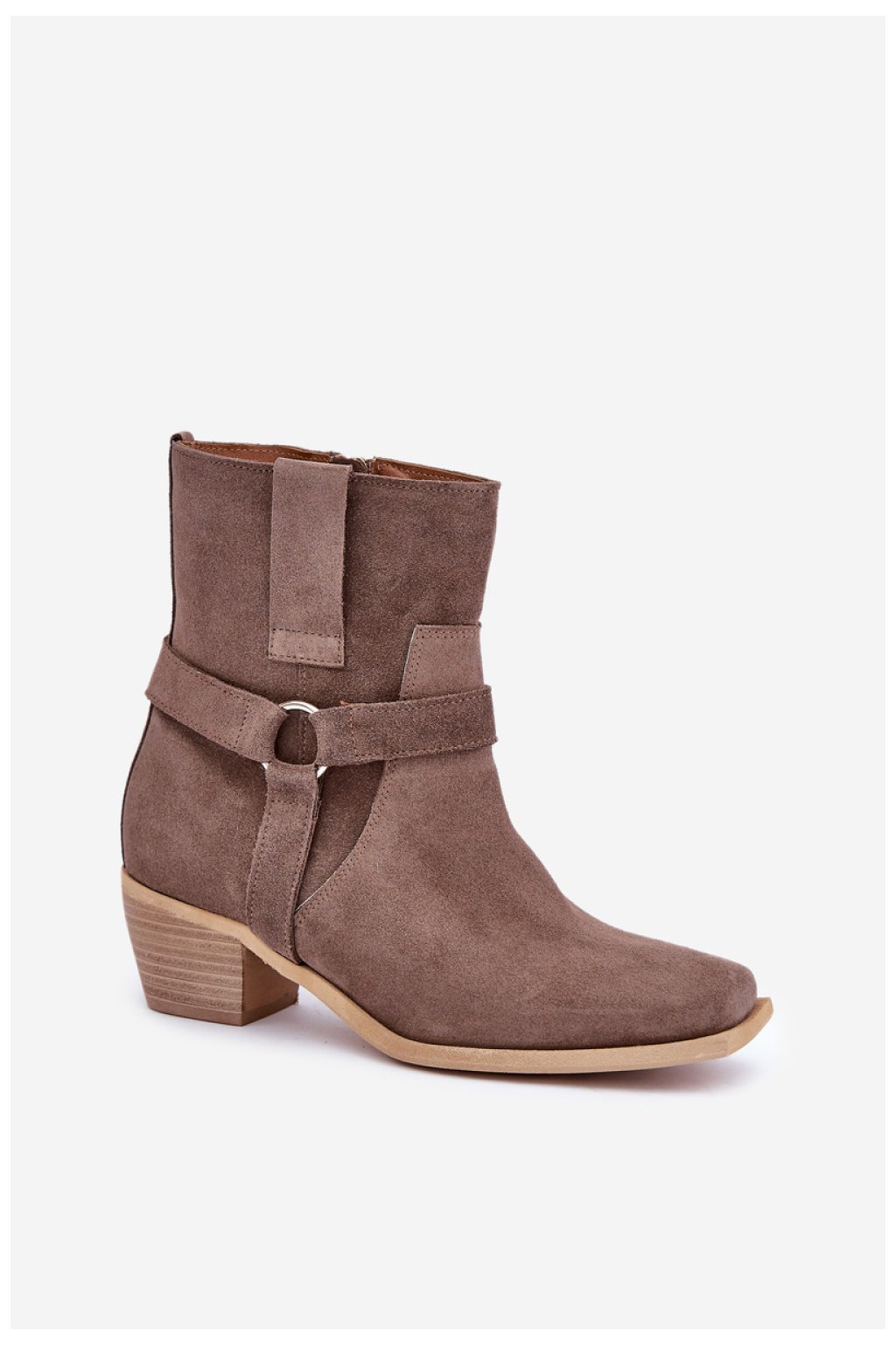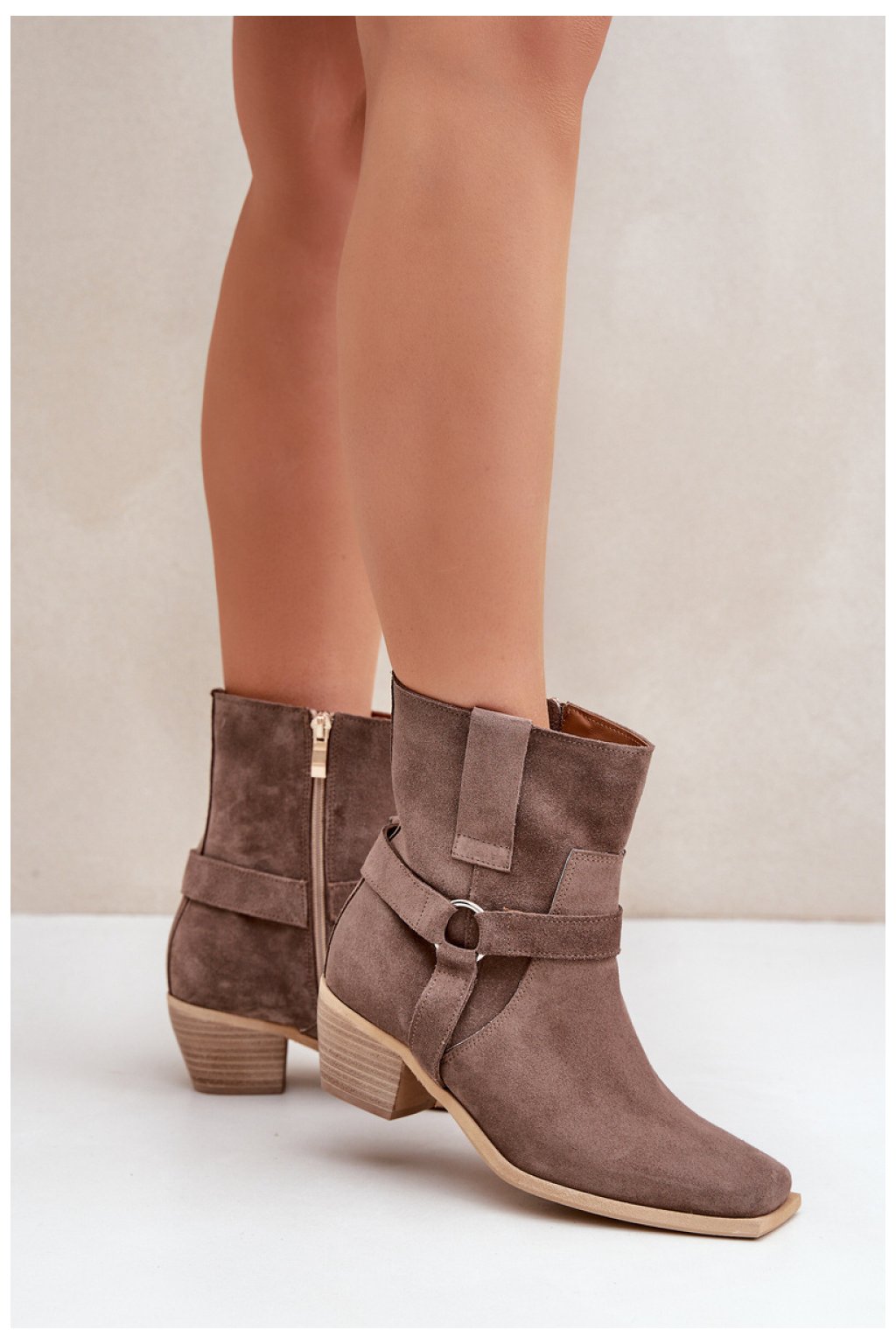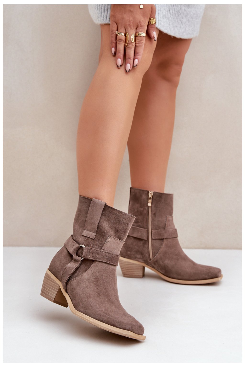 Dámské kotníkové boty z přírodního semiše jsou stylovým modelem, ideálním na chladnější dny. Umístěné na stabilní podpatku typu sloupek poskytují pohodlí a jemně prodlužují postavu. Zapínají se na zip pro snadné obouvání, a kulaté špičky s čtvercovou podrážkou jim dodávají moderní charakter. Svršek zdobí pásky s ozdobným prvkem, což dodává eleganci a přitahuje pozornost. Tyto výjimečné kotníkové boty se skvěle hodí jak do každodenních, tak do formálních stylizací, spojují pohodlí s módním designem.