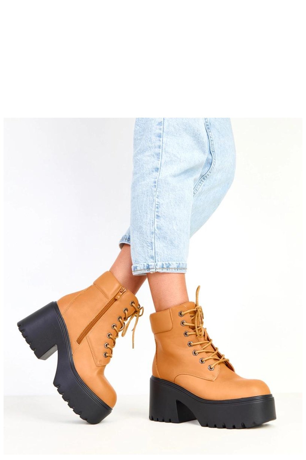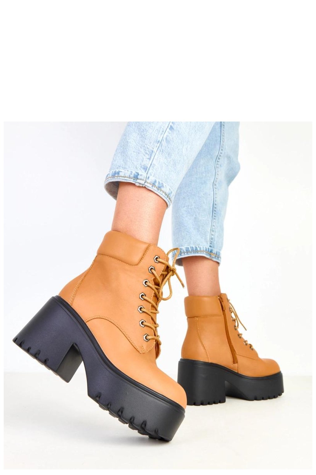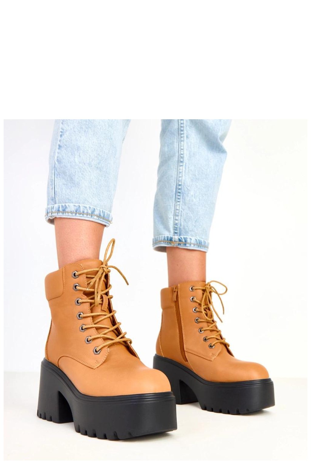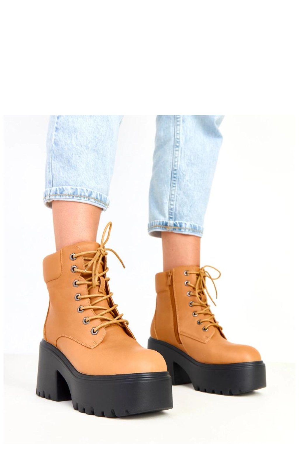 Moderní a výrazné masivní dámské boty vyrobené z trvanlivé ekologické kůže. Model má charakteristickou čtvercovou špičku, 12centimetrový svršek, pevný 9centimetrový podpatek a 5centimetrovou platformu, co jim dodává silný, módní charakter a zajišťuje pohodlí při chůzi. Boty mají klasické šněrování doplněné praktickým zipem, který usnadňuje obouvání. Vnitřek je vybaven textilií bez podšívky, což je činí ideálními pro přechodné období. Jsou to boty ve stylu chunky, které dokonale doplní městské outfit, ideální k džínám, kožené bundě nebo oversized kabátu.