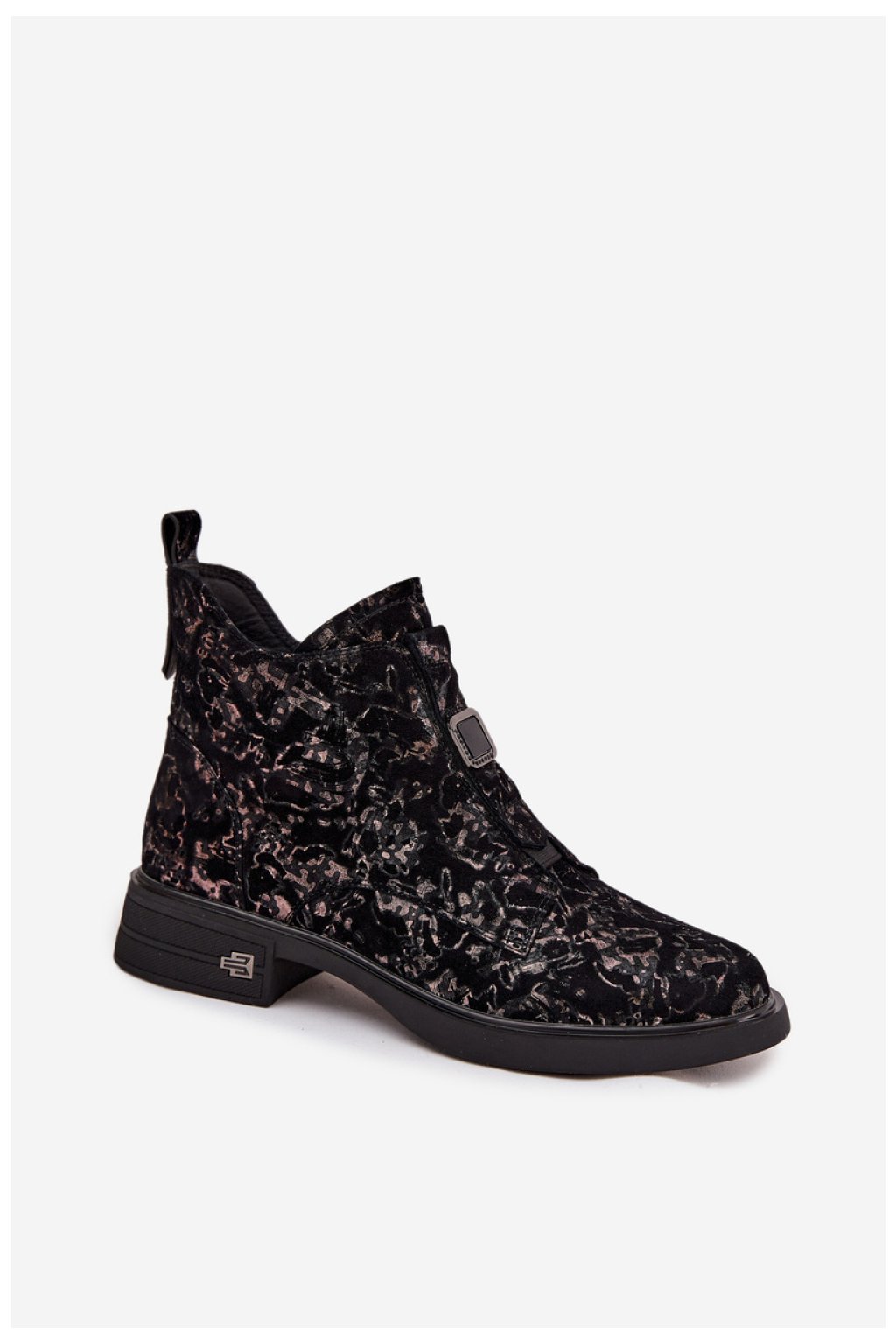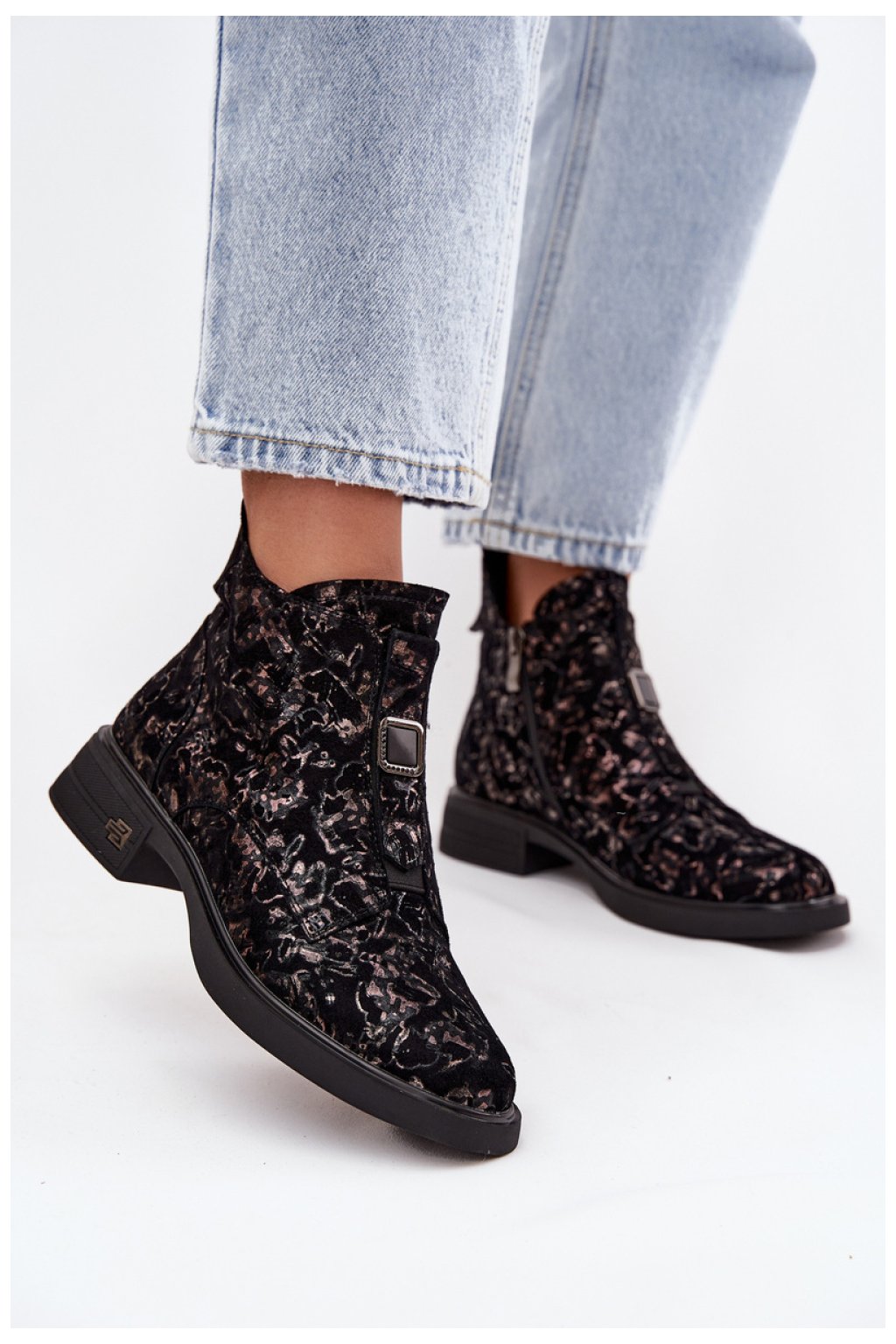 Elegantní dámské kotníčkové boty vyrobené z přírodního semiše jsou nabídkou pro ženy, které si cení stylu a pohodlí. Nízký podpatek ve tvaru kostky zajistí stabilitu a pohodlí při nošení, což znamená, že se model skvěle hodí do každodenního nošení. Zapínání na zip usnadňuje obouvání a jemné vyztužení zaručuje teplo v chladnějších dnech. Pozornost přitahuje ozdobný detail umístěný vpředu, který dodává eleganci a zdůrazňuje jejich jedinečný charakter. Tyto kotníčkové boty skvěle doplní elegantní sestavy na podzimně-zimní sezónu.