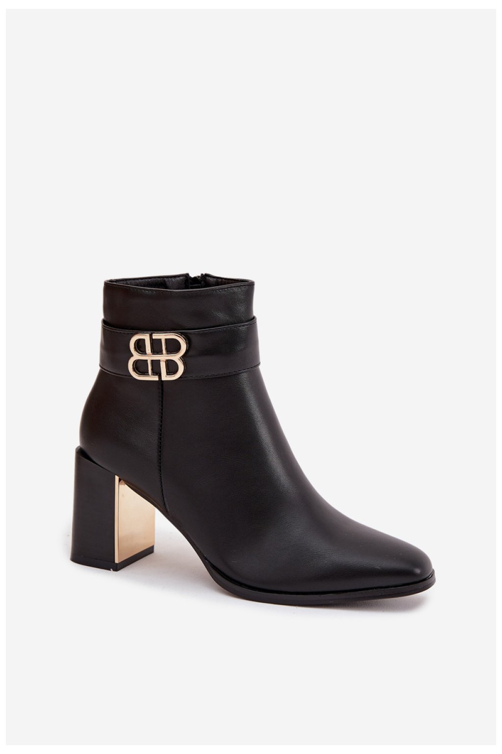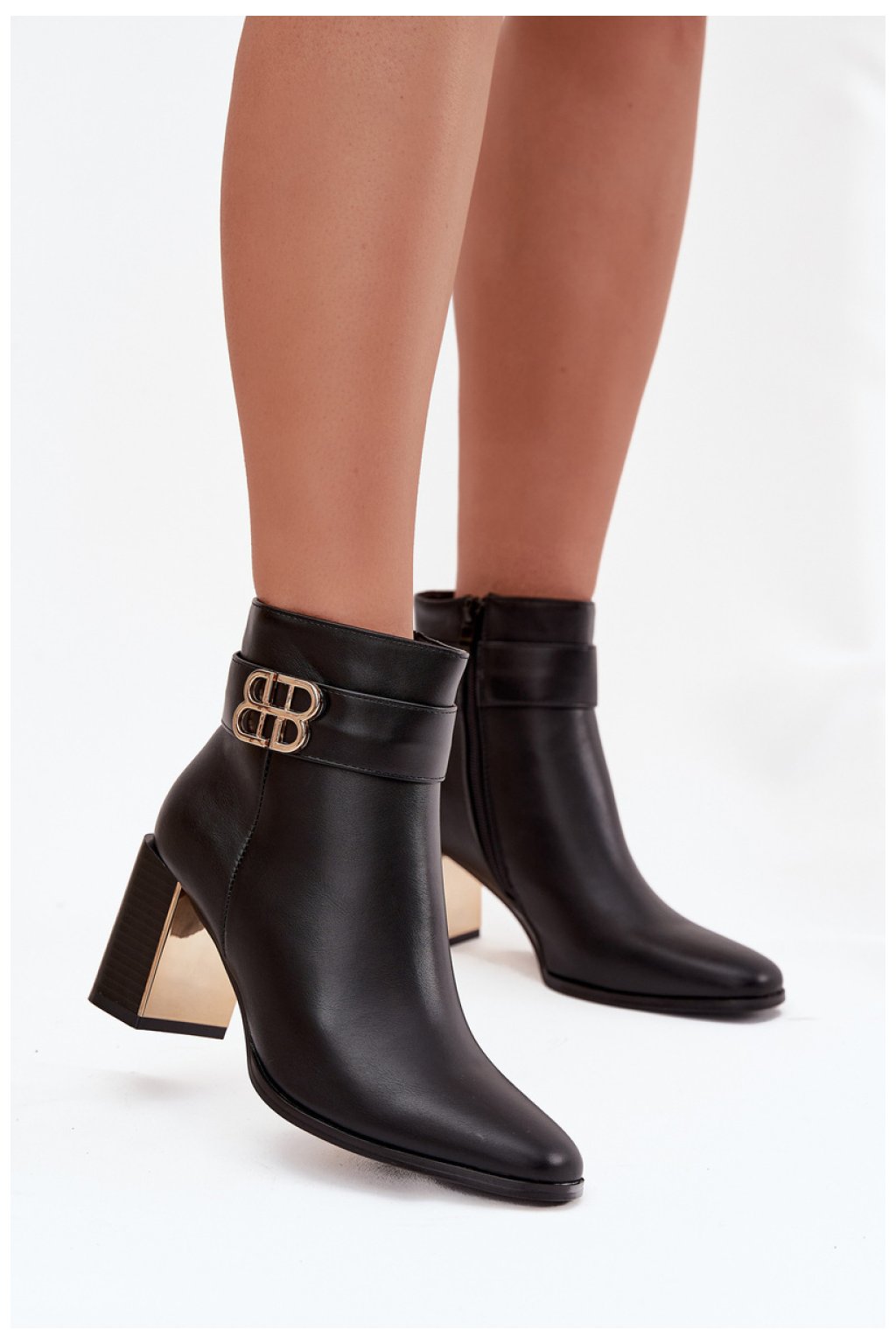 Dámské botky vyrobené z ekokože. Model je umístěn na stabilním podpatku ve formě sloupku, zdobeném zlatým zrcadlovým prvkem, který celku dodává jedinečný charakter. Boty se zapínají na zip, co zajišťuje pohodlí při obouvání a ideální přizpůsobení. Horskou částka zdobí pásek s dekorativním prvkem, který představuje jemný, stylový akcent. Jedná se o univerzální botky, které se skvěle hodí jak do elegantních, tak do každodenních stylizací.