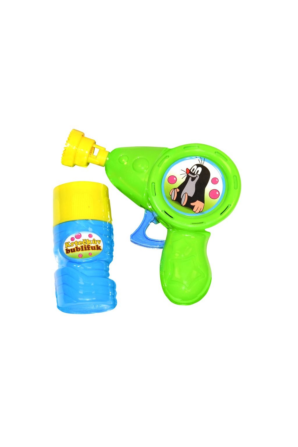 Krtečkova bublifuková pistole z plastu - mačkací. Baterie nejsou potřeba. Součástí balení je bublifuková náplň o objemu 60ml. Dvě barevná provedení pistolky. Jednoduše namočte ústí pistolky do roztoku a následným rychlým mačkáním bublifukovače vytvoříte větší nožství menších bublinek, pomalým zmáčknutím vykouzlíte bubliny větší.