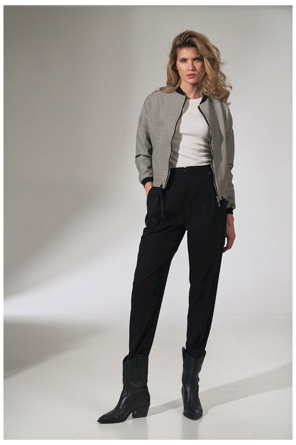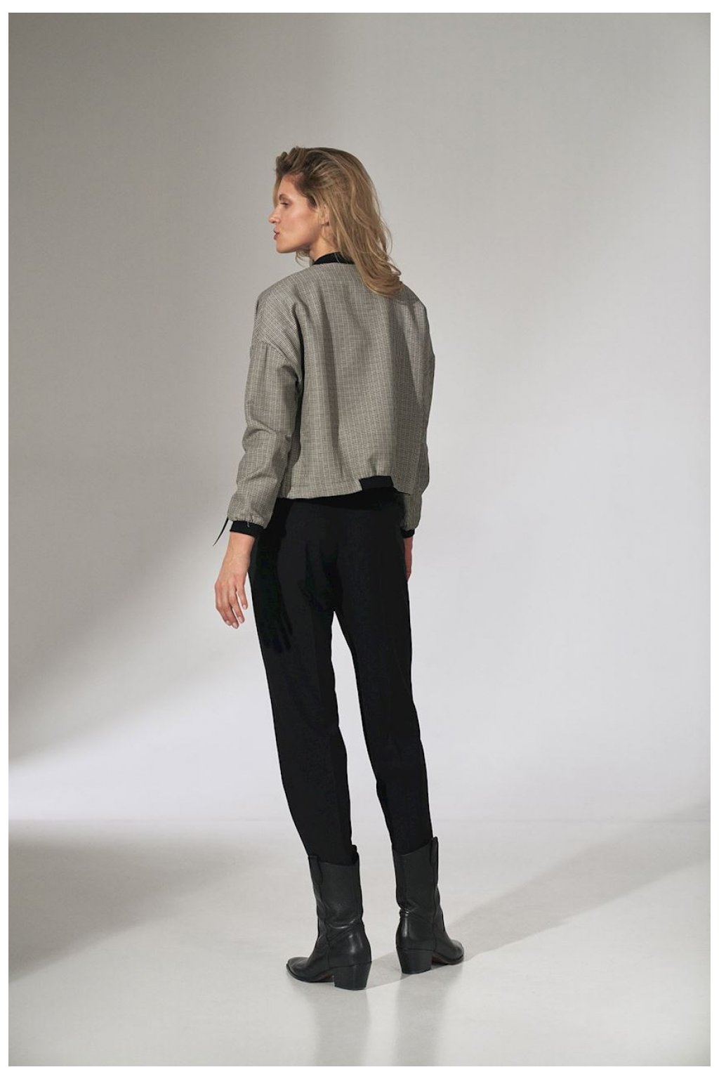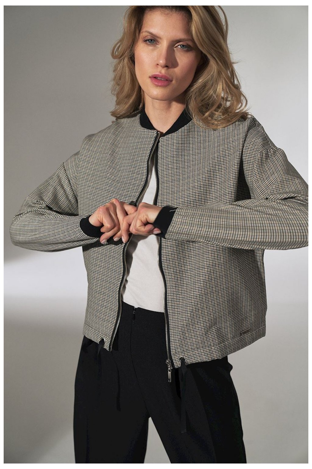 Tenká kostkovaná bunda bomber bez podšívky, zapínání na zip vpředu, žebrované rukávy a výstřih, kapsy v bočních švech, dole zavázaná ozdobnou stuhou.