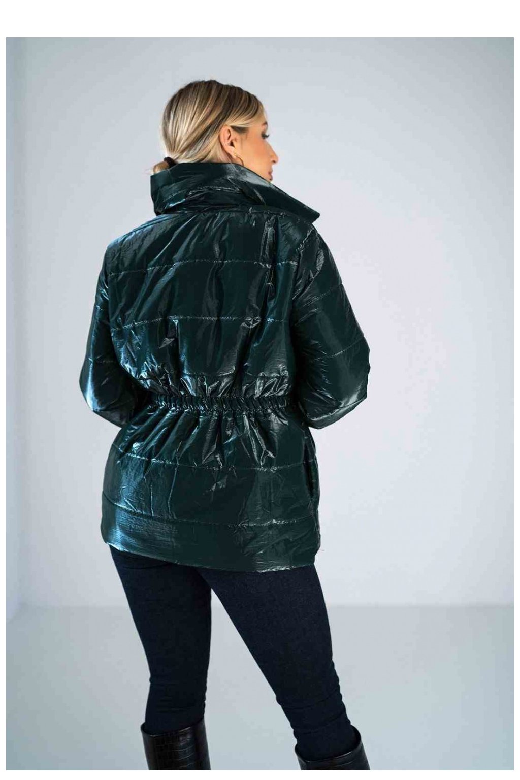 Lesklá prošívaná bunda do boků s vysokým stojáčkem. V pase a na rukávech je nařasený do gumy. Zapínání na patentky, kapsy na zip, zateplená podšívka.