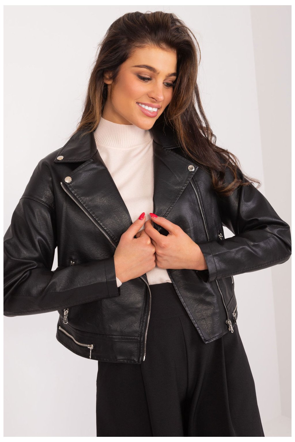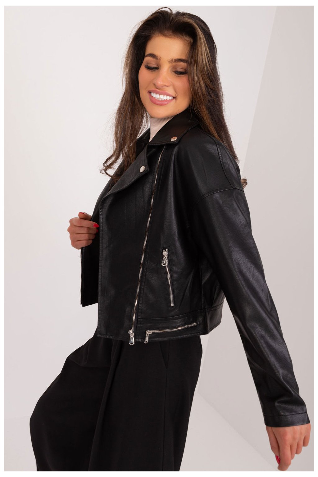 Krátká bunda ramon z ekologické kůže s dlouhými rukávy a zapínáním na zip. Bunda je podšitá, má polstrovaný límec a kapsy na zip po stranách. Návrh na jarně-letní sezónu, ideální pro mnoho příležitostí.