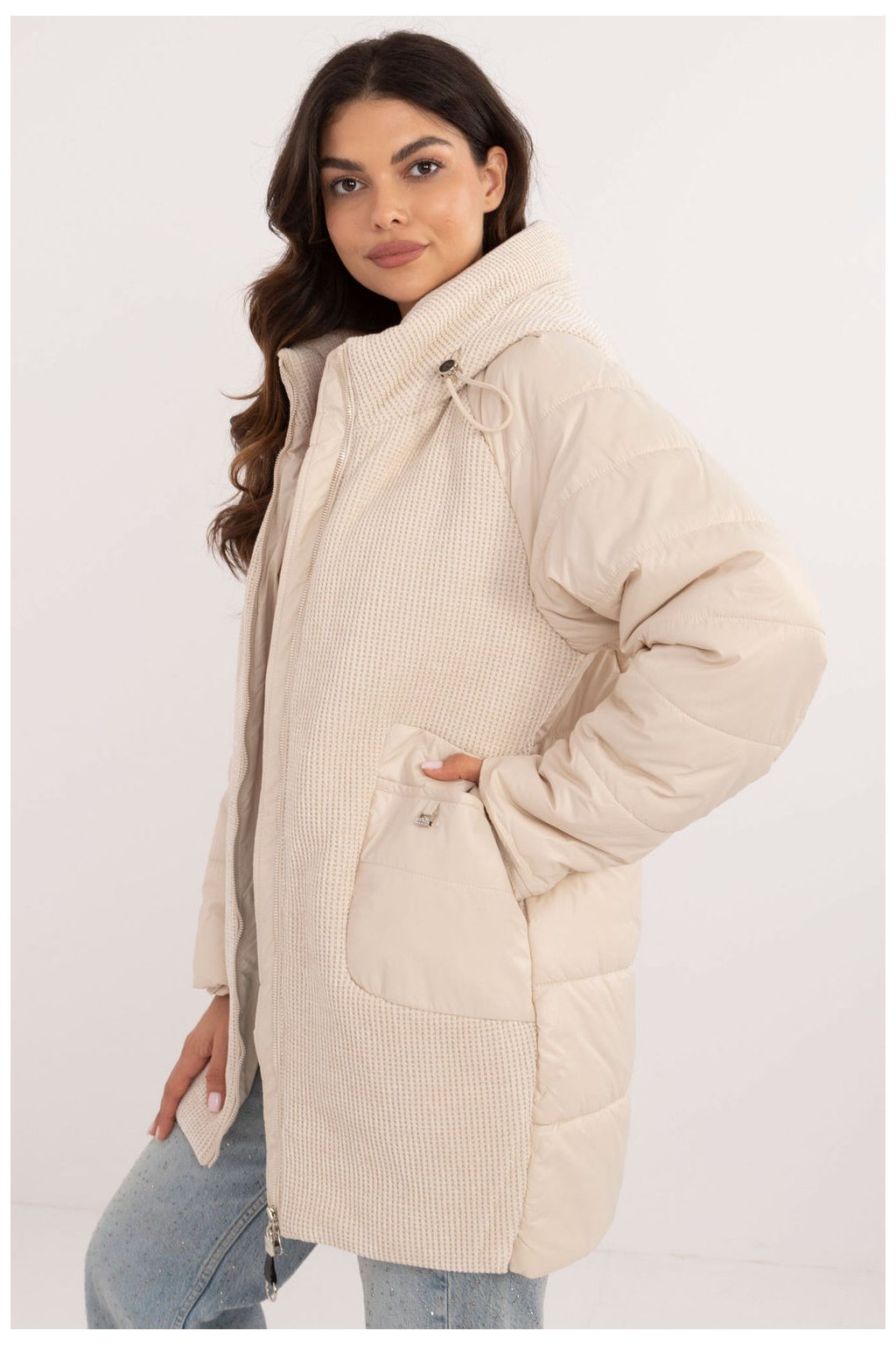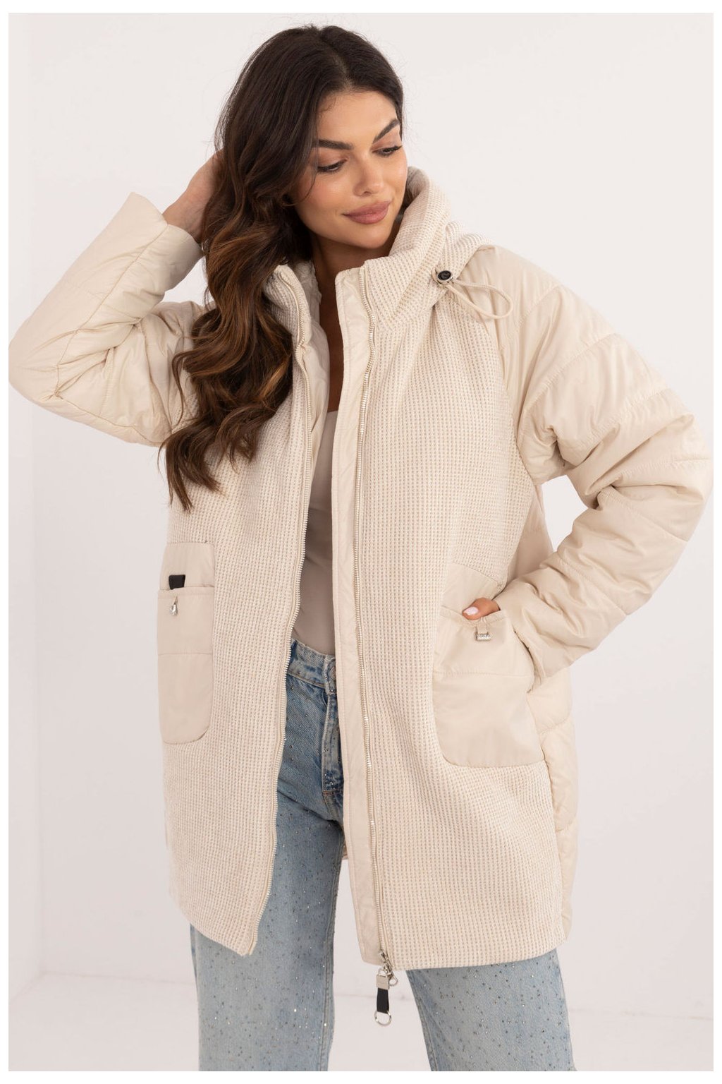 Dámská ležérní bunda s módní manšestrovou přední částí a kapucí, ideální pro každodenní vycházky v podzimním, zimním a jarním období. Je vyrobena z odolného polyesteru a kombinuje funkčnost s moderním designem. Hladký vzor a ozdobné prošívání dodávají bundě jedinečný charakter. Bunda má syntetickou izolaci, která vás udrží v teple v chladnějších dnech. Standardní délka a kapuce z manšestru poskytují stylovou ochranu před nepřízní počasí. Zapínání na zip a přídavné patentky zaručují pohodlí a dobrou izolaci před větrem. Praktickým doplňkem jsou nakládané kapsy a vnitřní podšívka přispívá k pohodlí. Stylová a praktická, ideální pro každodenní nošení.