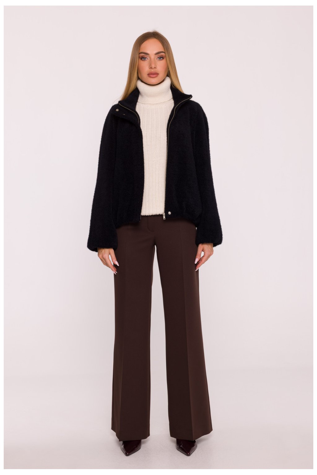 Stylová dámská bunda vyrobená z měkké pleteniny s krátkým vlasem je návrh spojující pohodlí a moderní charakter. Celá bunda je vybavena podšívkou, díky které se bunda skvěle přizpůsobuje a zajistí pohodlné nošení. Model je vybaven praktickým stojáčkem a zipem, doplněnými knoflíky umístěnými v dolní části plis a u límce. Široké, dlouhé rukávy s raglánovým střihem dodávají postavě lehkost a volnost, a boční kapsy s průchodem přidávají funkčnost. Bunda má volný, ležérní střih v lehce oversized stylu, jemně se přizpůsobující postavě. Její délka sahá k linii boků, což z ní dělá skvělý doplněk jak k džínům, tak k elegančnějším stylizacím. Navržena a ušita v Polsku, představuje výjimečné spojení kvality, pohodlí a moderního designu.