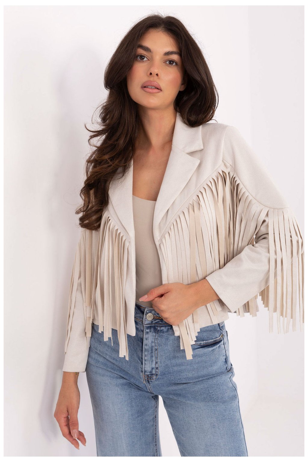 Dámská přechodná bunda s casual charakterem, ideální na podzim, zimu a jaro. Vyrobena z polyesteru a elastanu, nadchne hladkou fakturou materiálu a pohodlným střihem, který se skvěle hodí do každodenních outfitů. Model standardní délky je vybaven klasickým límcem a klopy, které dodávají celku nadčasový styl. Největší ozdobou bundy jsou řasy umístěné na rukávech, přední části a zádech, které dodávají originální, lehce boho charakter a vystupují stylizaci. Lehká, nezateplená a bez zapínání, skvěle doplňuje každodenní outfit, poskytuje pohodlí a volnost pohybu a zároveň přitahuje pozornost neokoukaným zakončením.