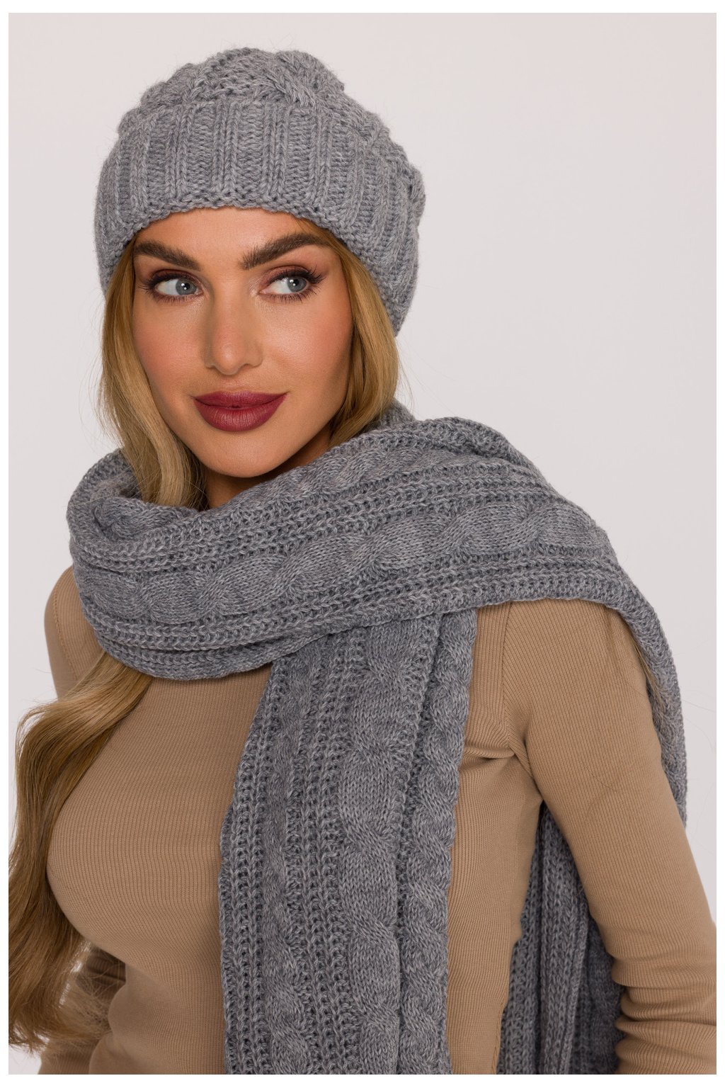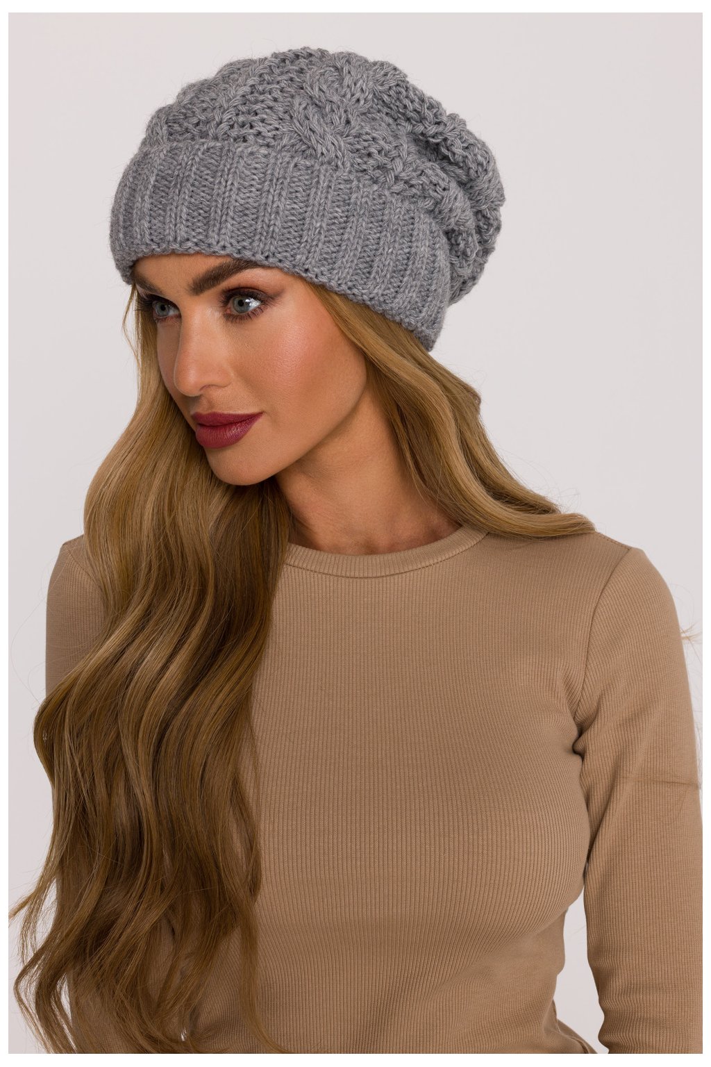 Teplý čepice vyrobený z měkké příze s hrubým, copánkovým vzorem. Jednoduchý střih s jemným prostorem v horní části dodává celku volný, stylový charakter. Ohnutý lem zajišťuje další pohodlí a lepší přizpůsobení, zatímco dekorativní copánkový vzor přidává klasický zimní šarm.