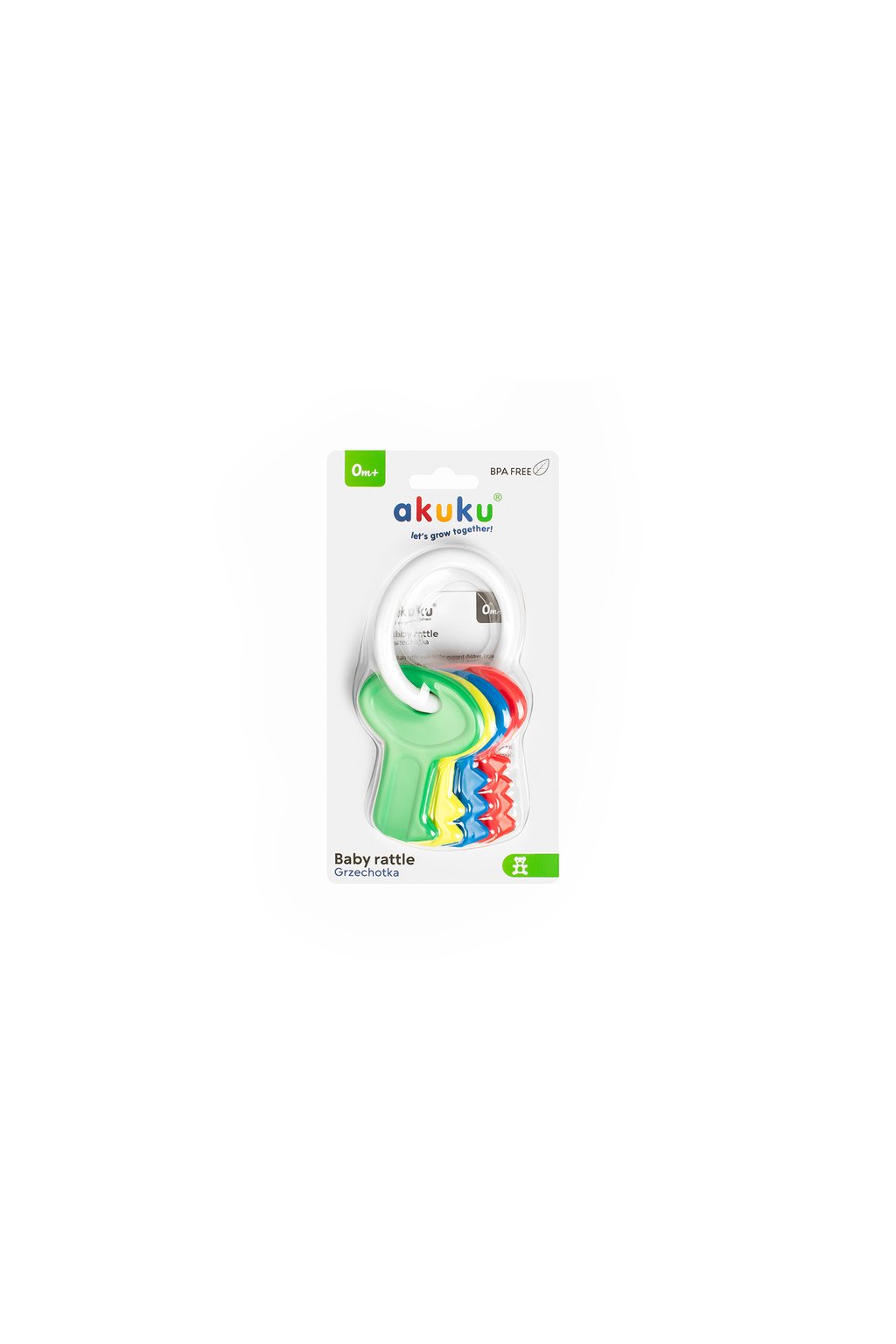 Chrastítko pro miminko Akuku. Chrastítko je ideální první hračkou pro miminko, protože je lehké a snadno uchopitelné. Dítě ji může snadno chytit a držet v ručičkách. Má jemně zaoblené tvary. Hračka motivuje dítě k pohybu a hře, čímž stimuluje jeho psychomotorický vývoj. Určeno pro děti ve věku 0m+. Pokyny: Hračku udržujte v čistotě. Před prvním použitím chrastítko přelijte vařící vodou. Nevařte ji ani nedezinfikujte. Pro zachování hygieny pravidelně omývejte chrastítko jemným prostředkem, důkladně opláchněte a nechte vyschnout. Výrobce: Albis Mazur sp. z o.o., Chotów 24a 63-460, Nowe Skalmierzyce., info@akuku.eu. Upozornění: Nenechávejte dítě samo bez dozoru. Obal není hračka, odstraňte ho z dosahu dítěte.Doplňkové parametry