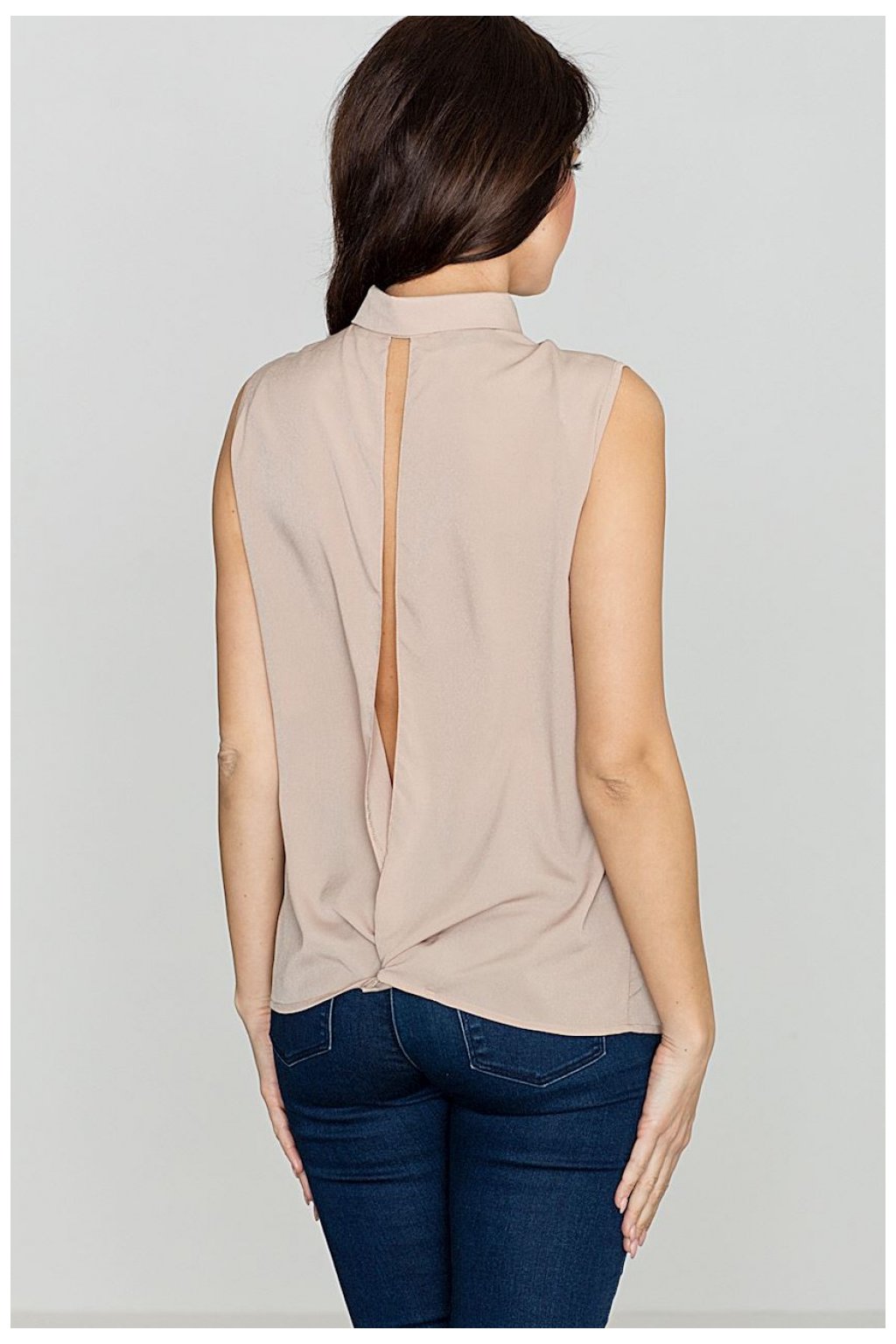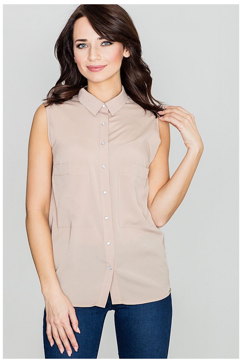 Košile z jemné tkaniny. Klasický límec, bez rukávů, zapínání na lesklé perly. Velké překrývající se kapsy v oblasti prsou. Zadní díl s jemným rozparkem a zavazováním ve spodní části. Moderní pojetí elegance.