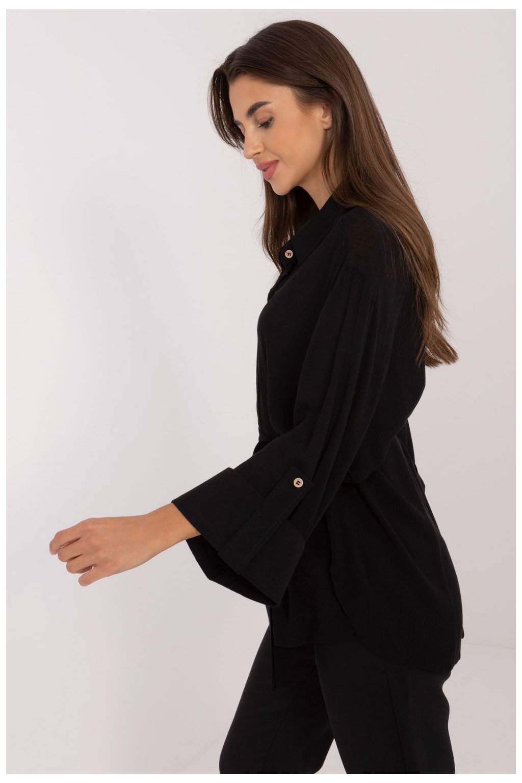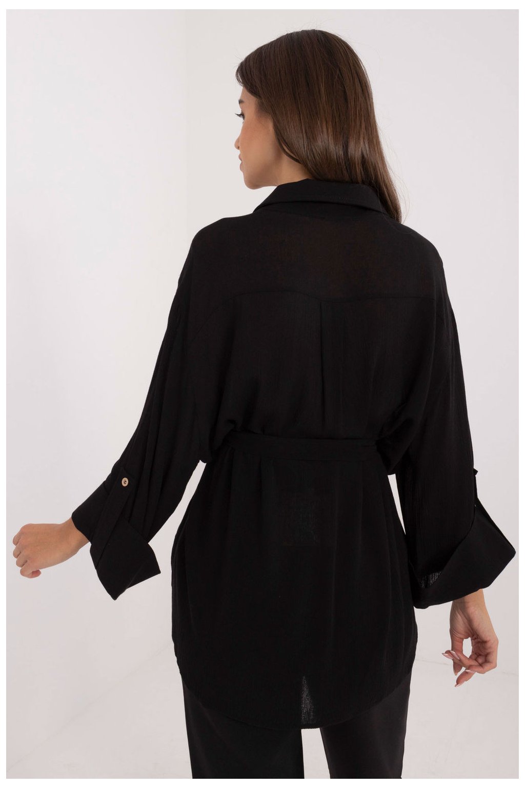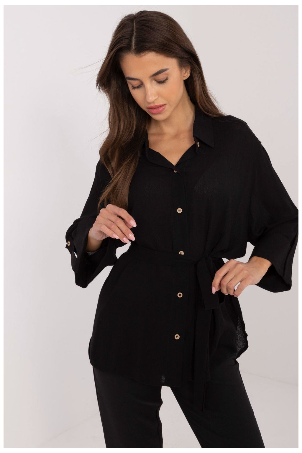 Ležérní dámská košile, ideální pro každodenní nošení i do práce. Je vyrobena z hladké jednobarevné tkaniny, jejíž převažující složkou je bavlna, a poskytuje tak pohodlí a prodyšnost. Má klasický límec a rukávy ve 3/4 délce, což jí dodává ležérní, ale stylový nádech. Košile se standardní délkou a zapínáním na knoflíky má také pásek na zavázání, který zvýrazňuje pas a dodává ženský nádech. Jedná se o univerzální kousek, který je ideální pro ležérní styling a kombinuje pohodlí s klasickým stylem.