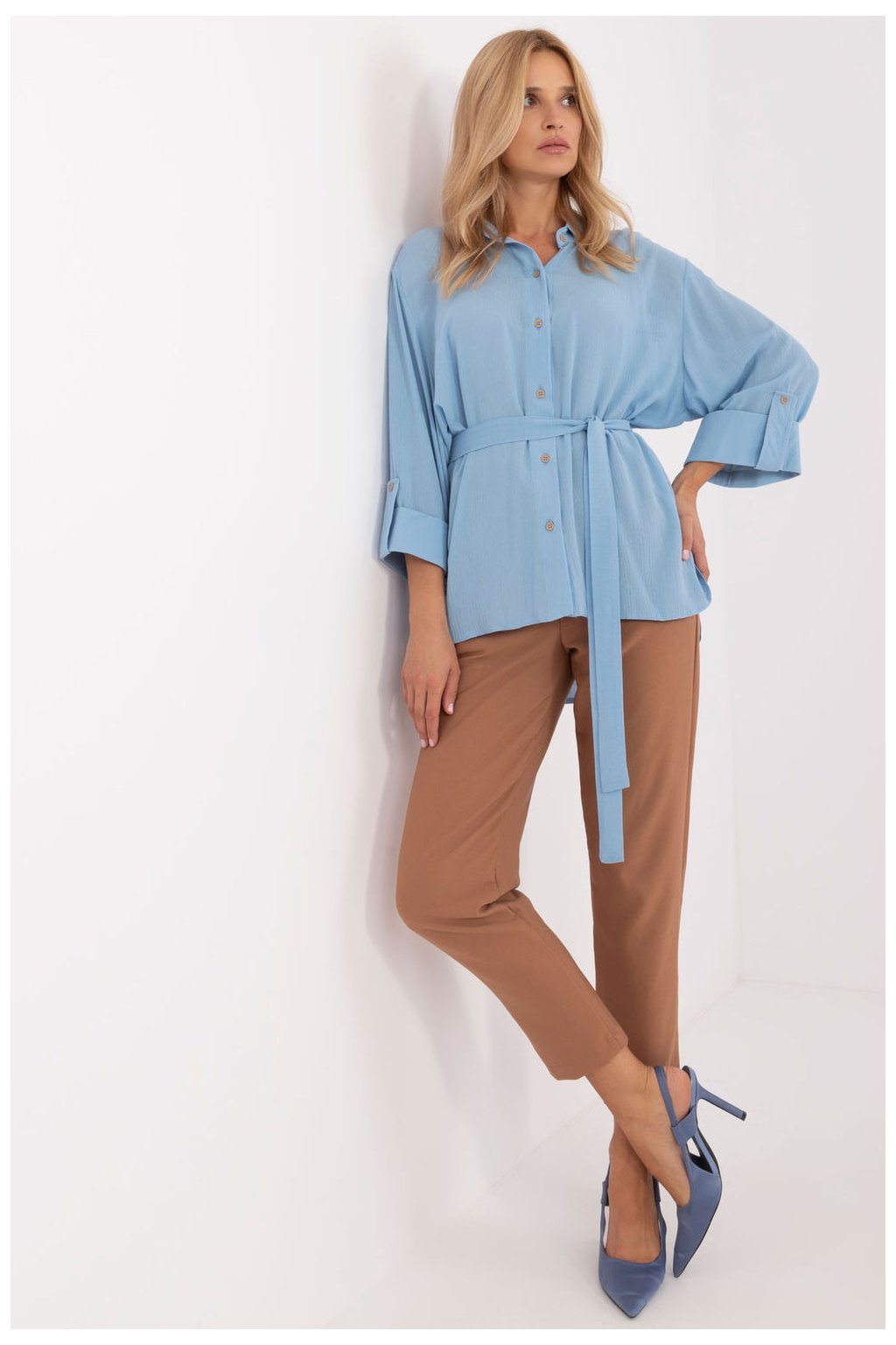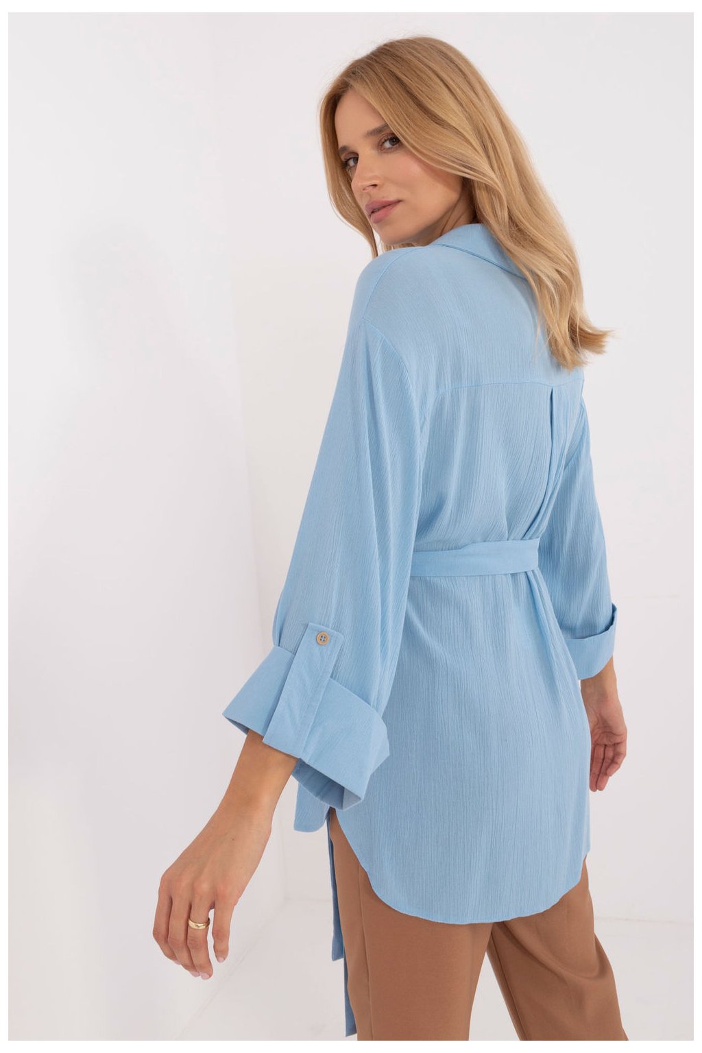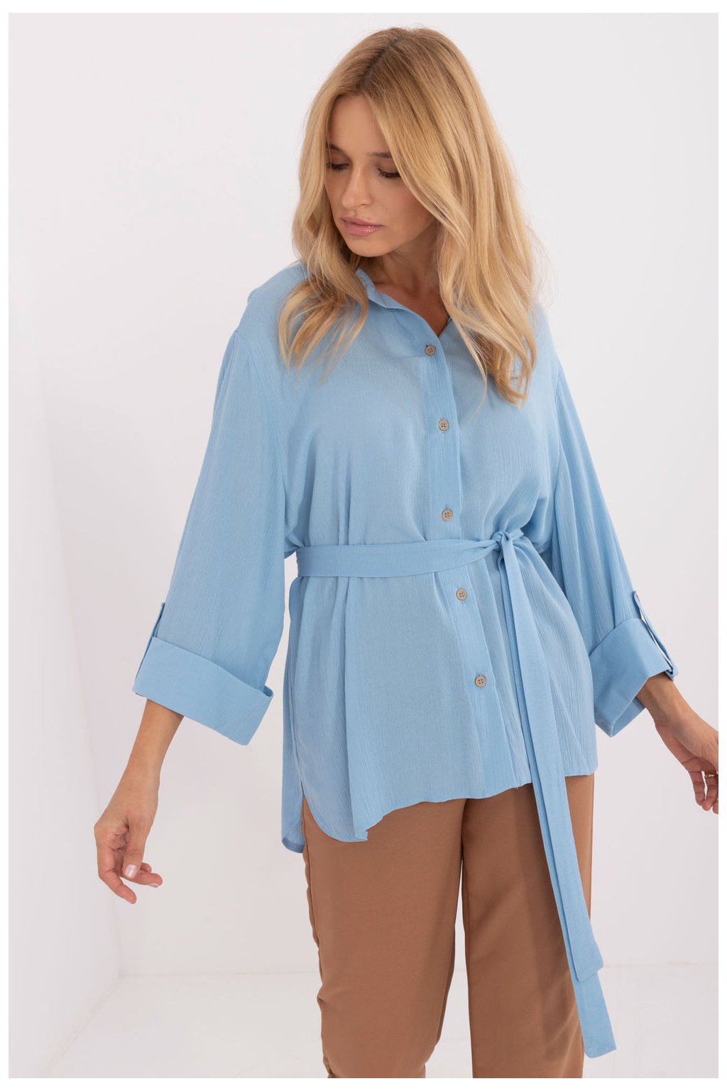 Ležérní dámská košile, ideální pro každodenní nošení i do práce. Je vyrobena z hladké jednobarevné tkaniny, jejíž převažující složkou je bavlna, a poskytuje tak pohodlí a prodyšnost. Má klasický límec a rukávy ve 3/4 délce, což jí dodává ležérní, ale stylový nádech. Košile se standardní délkou a zapínáním na knoflíky má také pásek na zavázání, který zvýrazňuje pas a dodává ženský nádech. Jedná se o univerzální kousek, který je ideální pro ležérní styling a kombinuje pohodlí s klasickým stylem.
