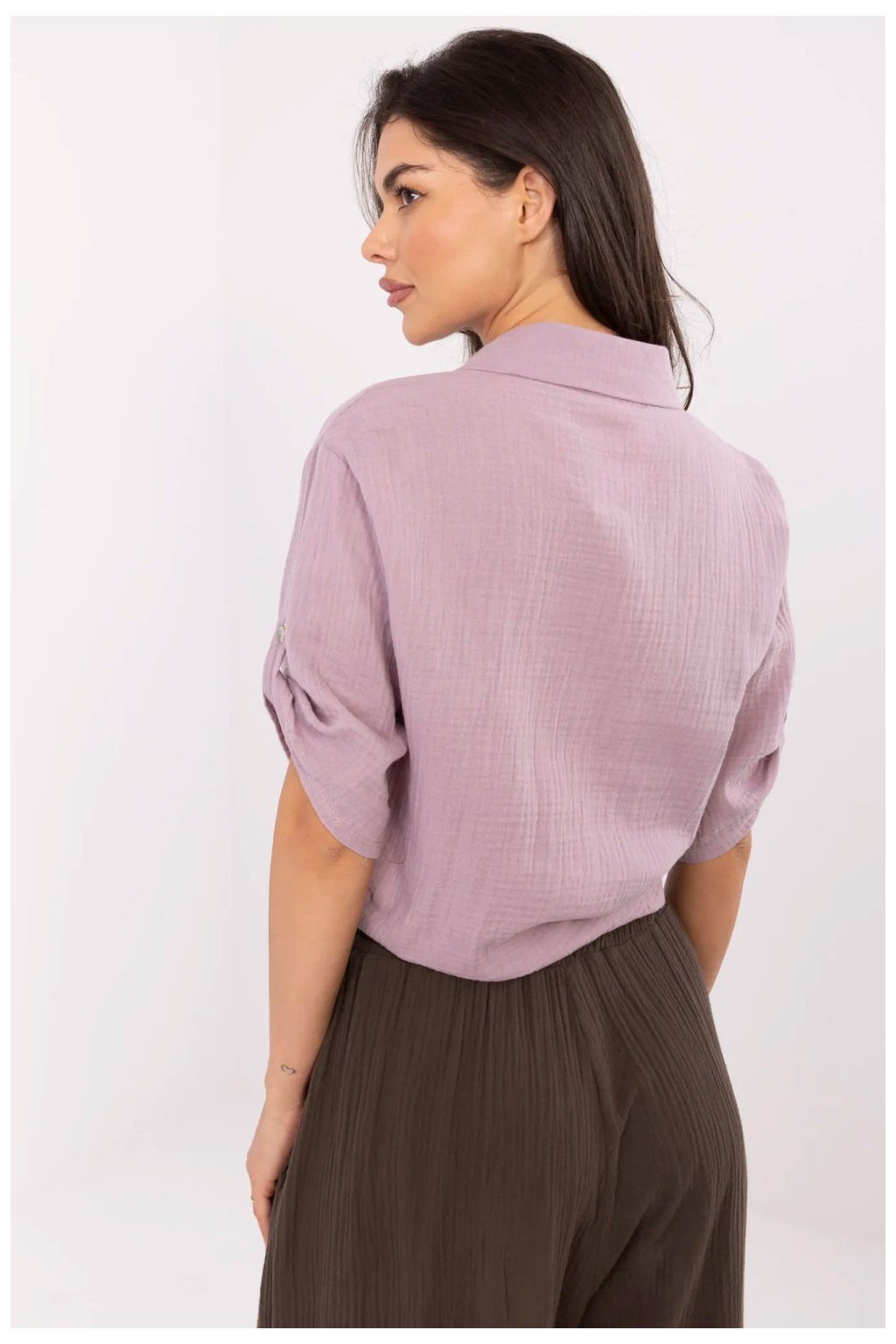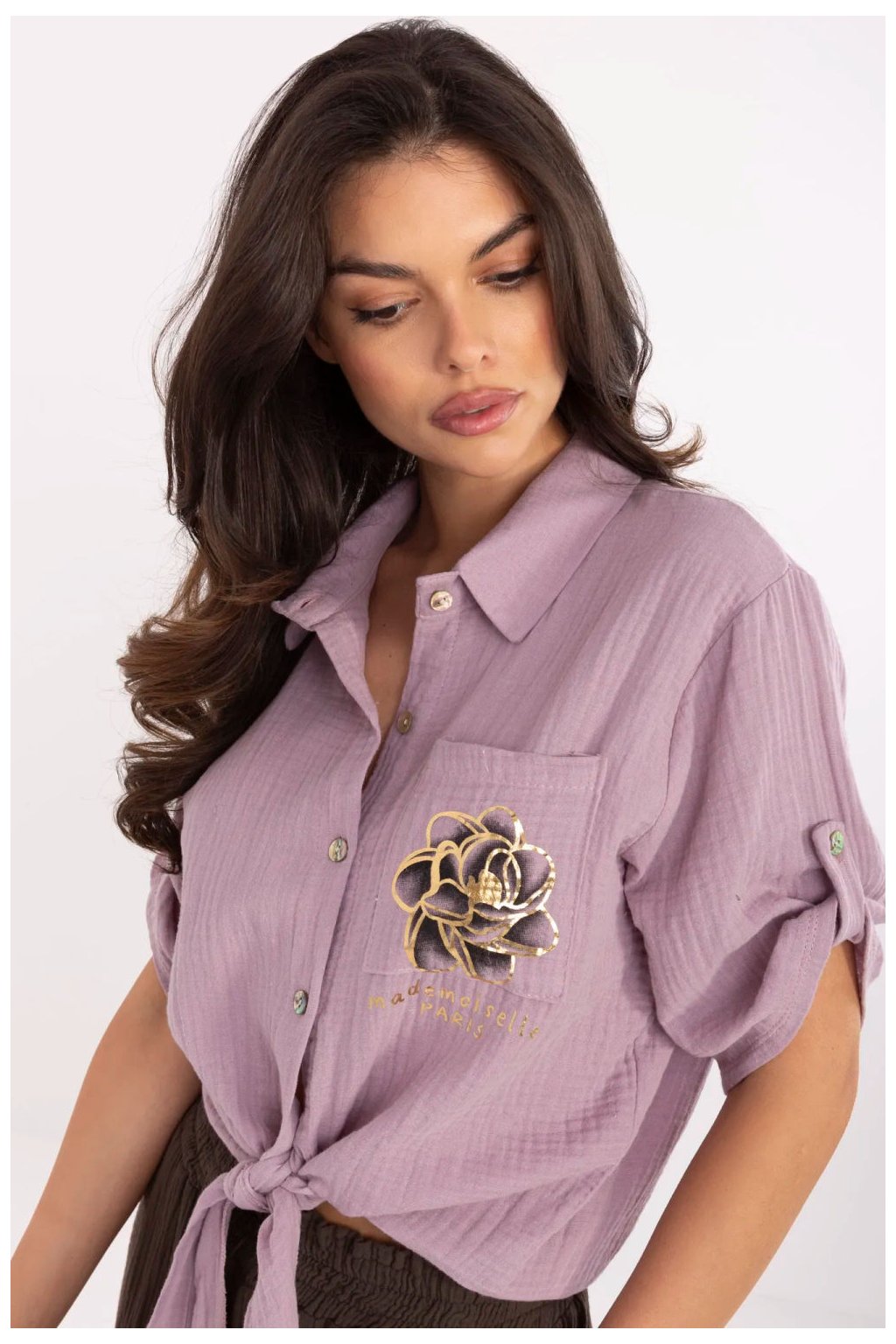 Elegantní dámská košile v casual stylu, ideální na každý den. Vyrobená z prodyšné přírodní bavlny, poskytuje pohodlí po celý den. Krátká délka a zapínání dole jí dodávají lehkost a dívčí charakter, a 3/4 rukáv se skvěle hodí na teplé dny. Košile se zapíná na knoflíky a je vybavena klasickým límečkem, co jí dodává univerzální, uvolněný vzhled. Na výšce prsou se nachází praktická kapsa zdobená decentním potiskem, který představuje jemný a zároveň stylový akcent.