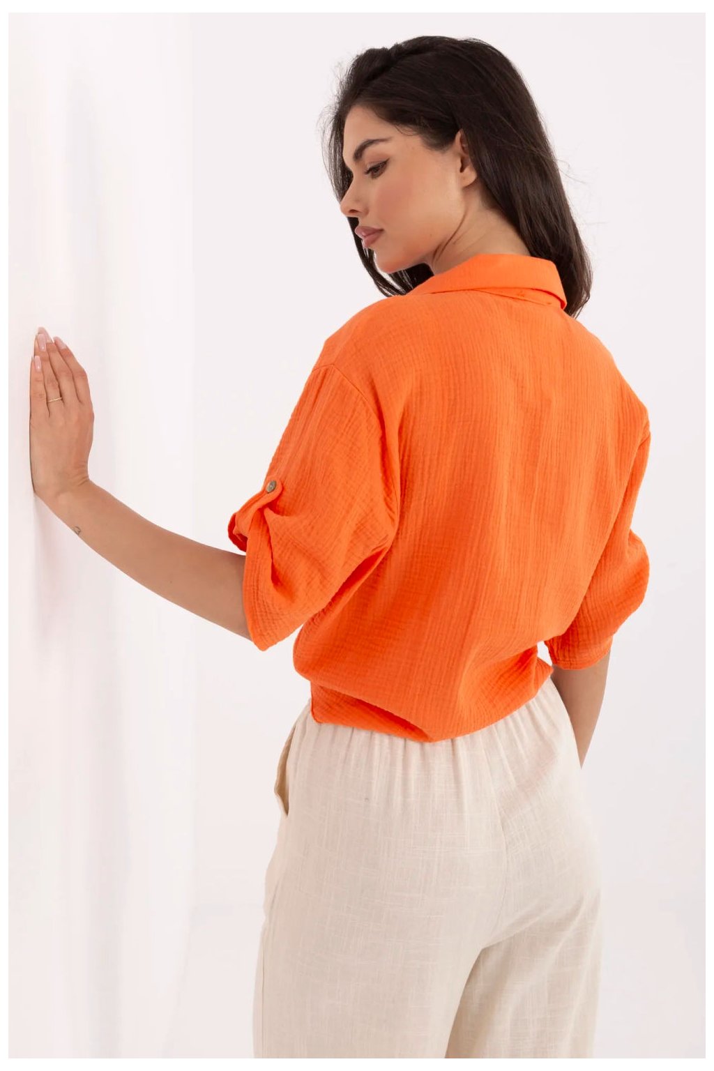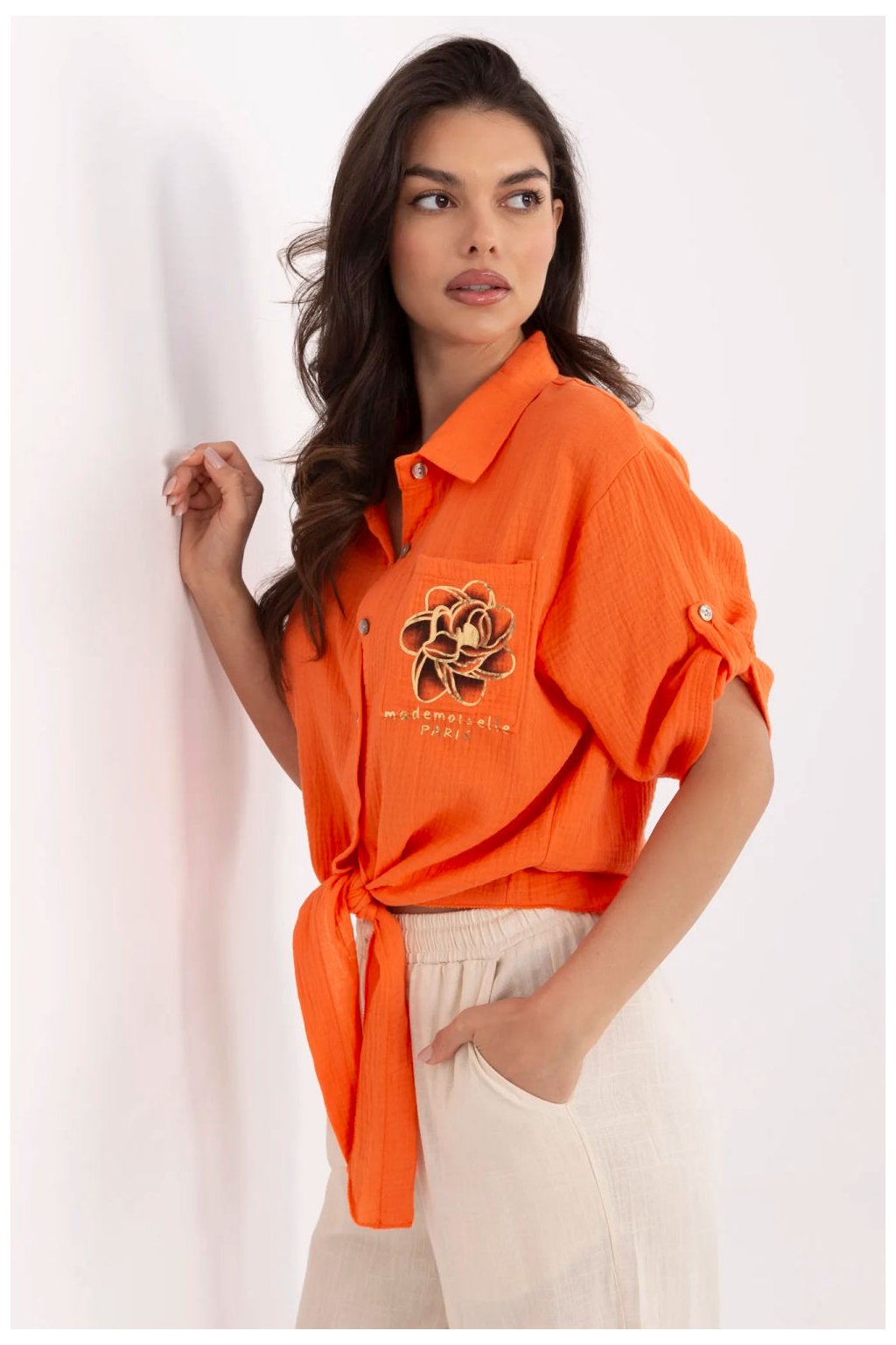 Elegantní dámská košile v casual stylu, ideální na každý den. Vyrobena z prodyšné přírodní bavlny, poskytuje pohodlí po celý den. Krátká délka a uvázání dole dodávají lehkost a dívčí charakter, zatímco 3/4 rukáv je skvělý pro teplejší dny. Košile se zapíná na knoflíky a je vybavena klasickým límcem, co jí dodává univerzální, uvolněný vzhled. Na hrudi se nachází praktická kapsa zdobená decentním potiskem, který představuje jemný, avšak módní akcent.