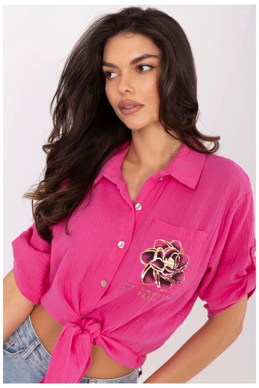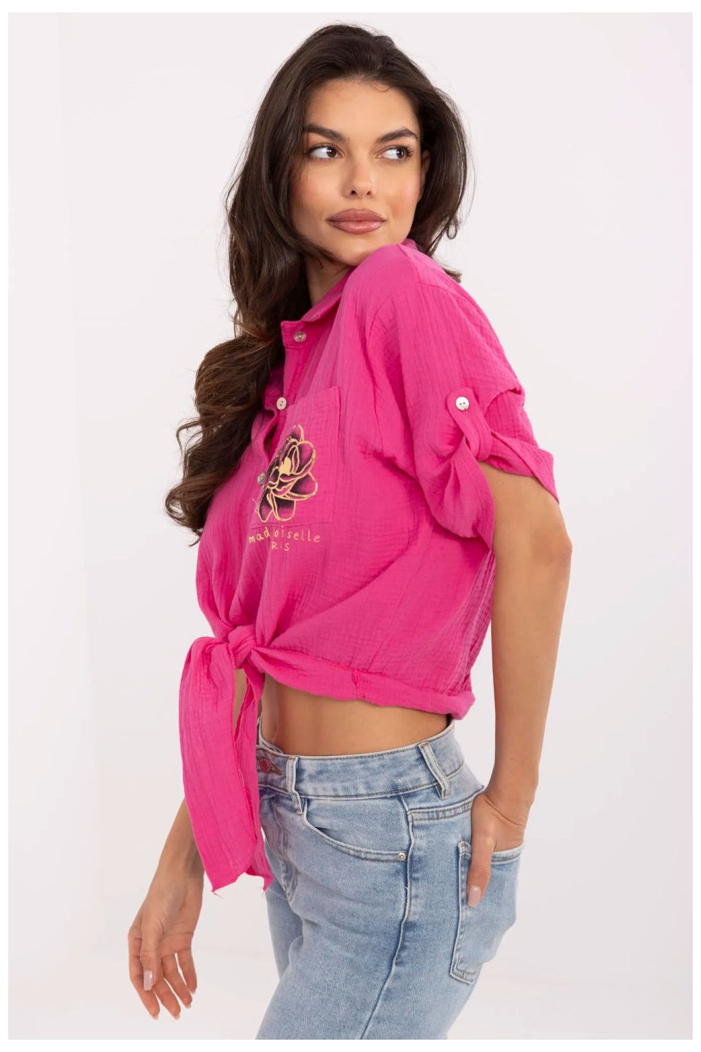 Elegantní dámská košile v casual stylu, ideální na každý den. Vyrobená z prodyšné přírodní bavlny, poskytuje pohodlí po celý den. Krátká délka a uvázání dole jí dodávají lehkost a dívčí charakter, a 3/4 rukáv se skvěle hodí do teplejších dnů. Košile se zapíná na knoflíky a je vybavena klasickým límečkem, co jí dodává univerzální a volný vzhled. Na hrudi je praktická kapsa zdobená decentním potiskem, který tvoří jemný a zároveň trendy akcent.