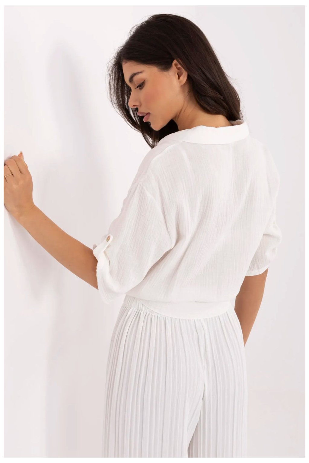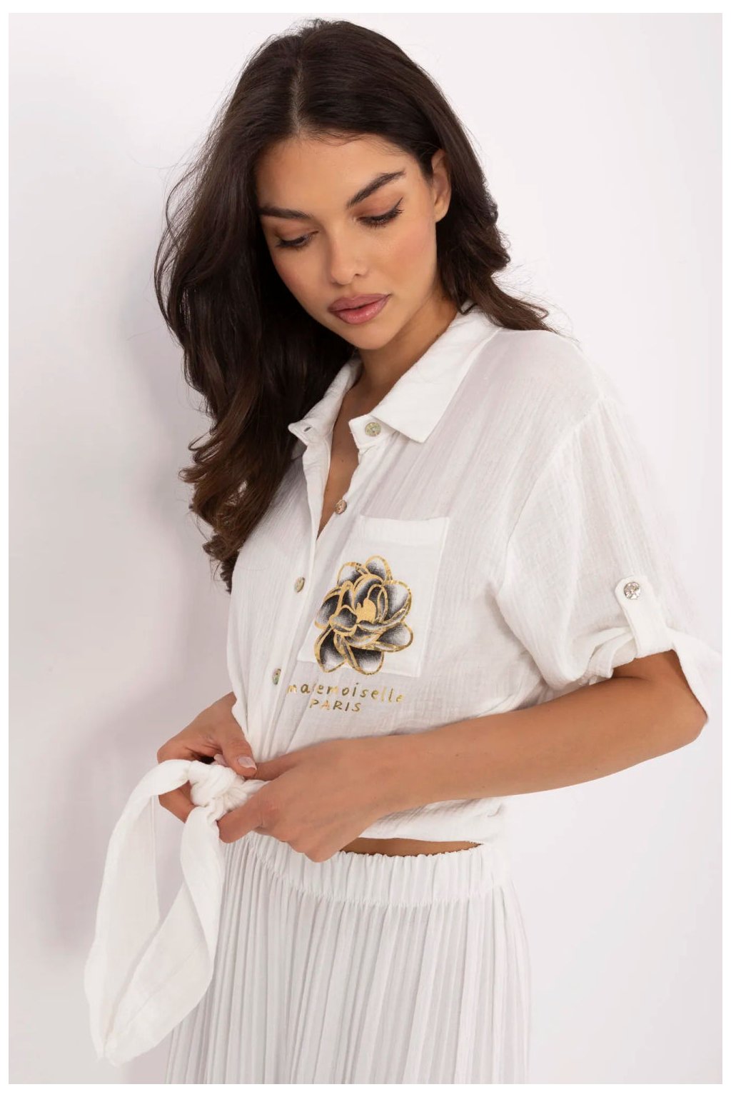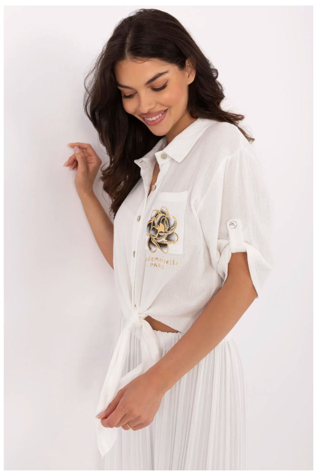 Elegantní dámská košile v casualovém stylu, ideální na každý den. Vyrobená z prodyšné přírodní bavlny, zaručuje pohodlí po celý den. Krátká délka a vázání dole jí dodávají lehkost a dívčí charakter, zatímco 3/4 rukáv skvěle poslouží v teplejších dnech. Košile se zapíná na knoflíky a je vybavena klasickým límcem, co jí dodává univerzální, volný vzhled. Na úrovni prsou je praktická kapsa zdobená decentním potiskem, který představuje jemný, avšak módní akcent.