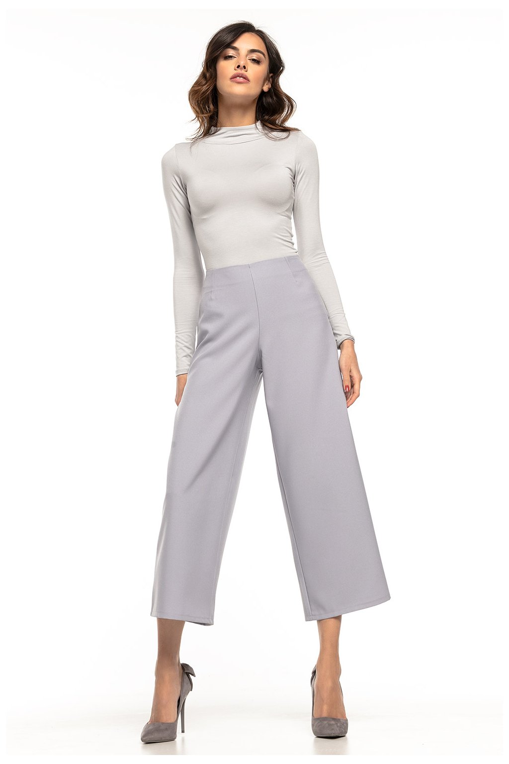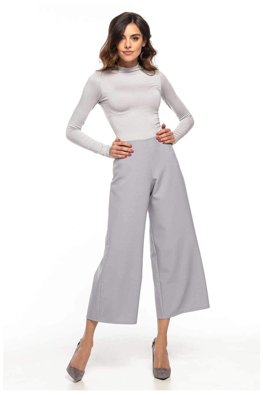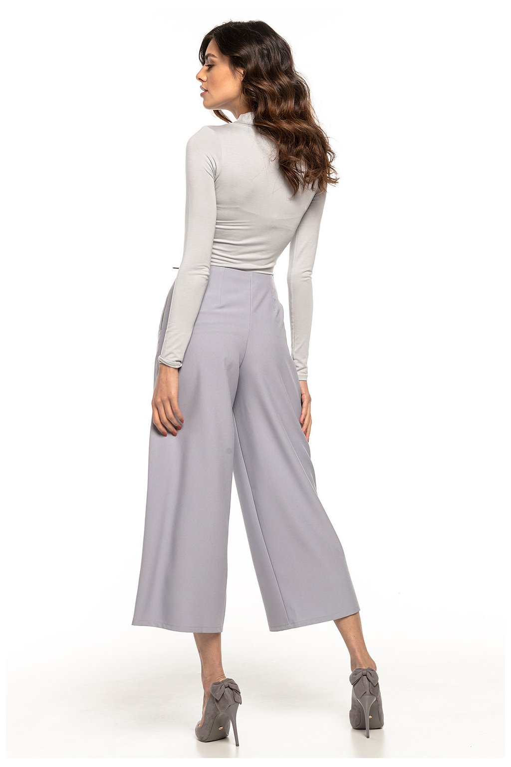 Kalhoty s vysokým sedem a širokými nohavicemi. Pro lepší tvarování jsme vpředu i vzadu všili záševky, díky nimž kalhoty krásně obepínají pas. Na boku je všitý ozdobný zip. Široké nohavice jsou naším odkazem na 70. léta, ačkoli jejich zkrácení na 7/8 délky působí moderněji. Kalhoty se hodí jak pro elegantní, tak pro ležérnější stylizace.
