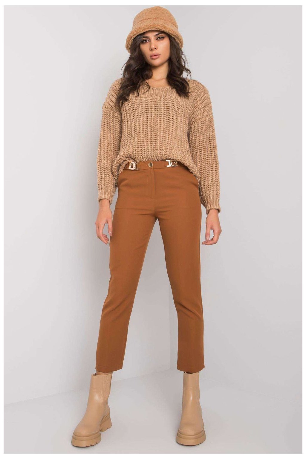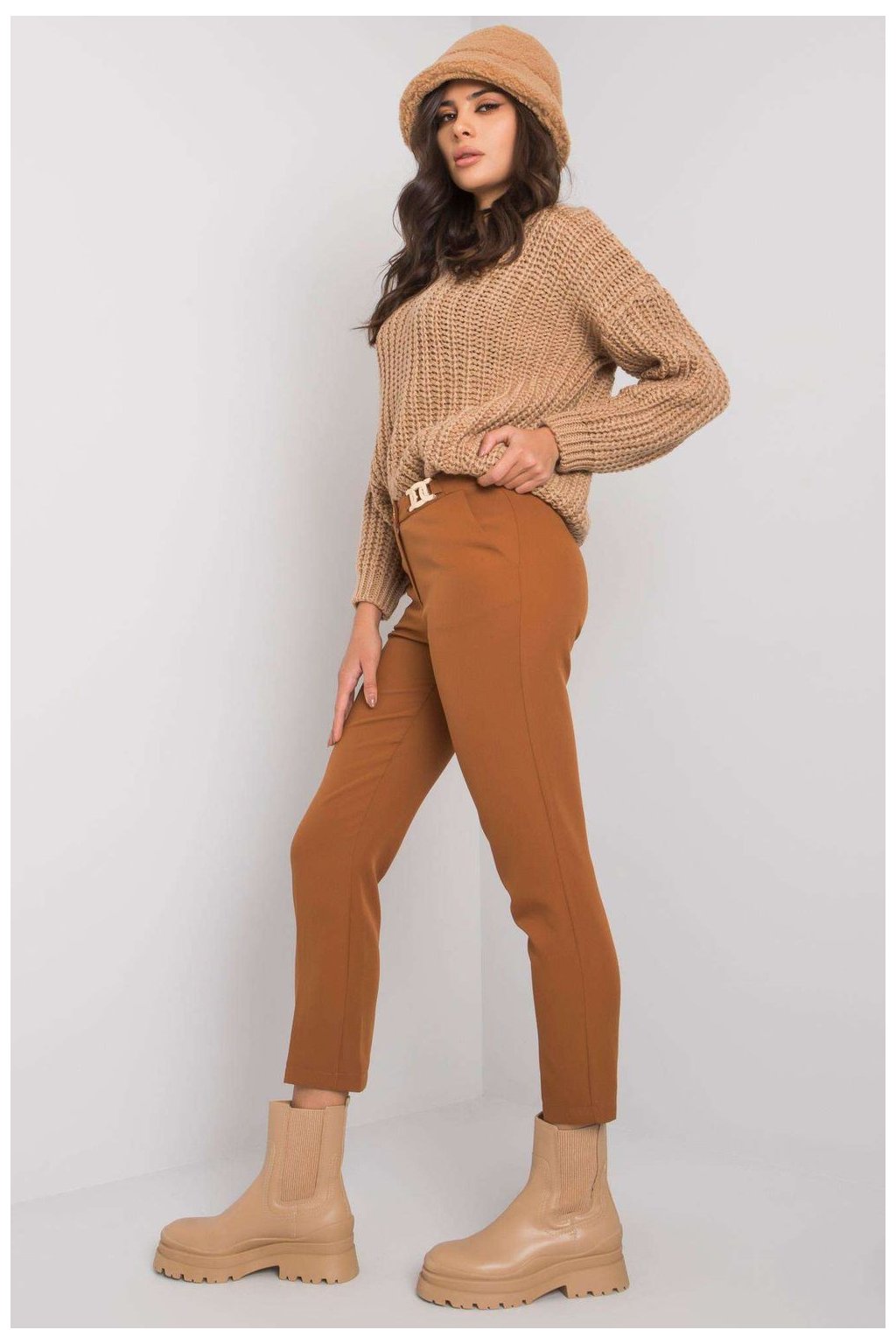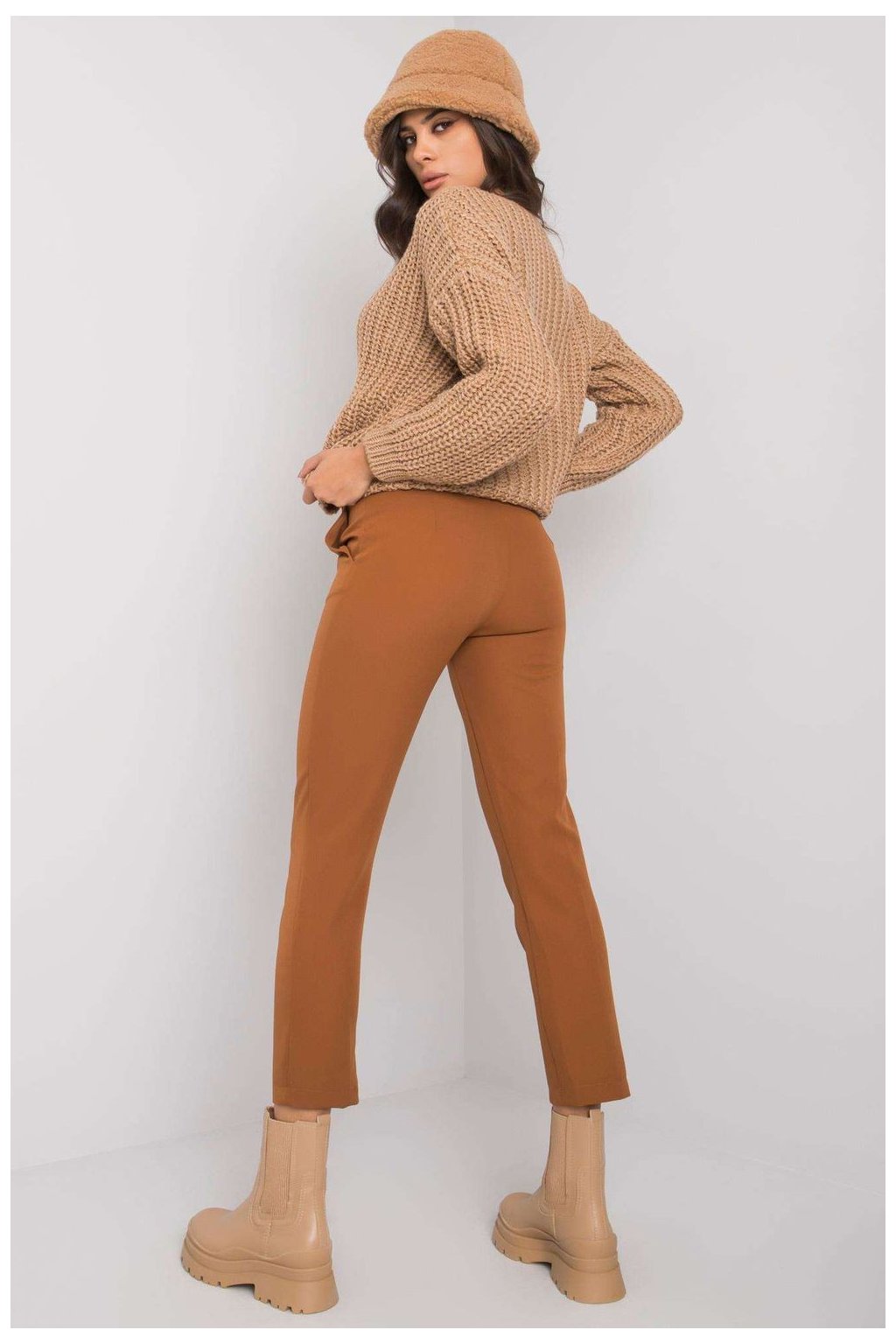 Zapínání cigaretových kalhot na zip a knoflík. Kapsy na bocích. Ozdobné přezky v pase.
