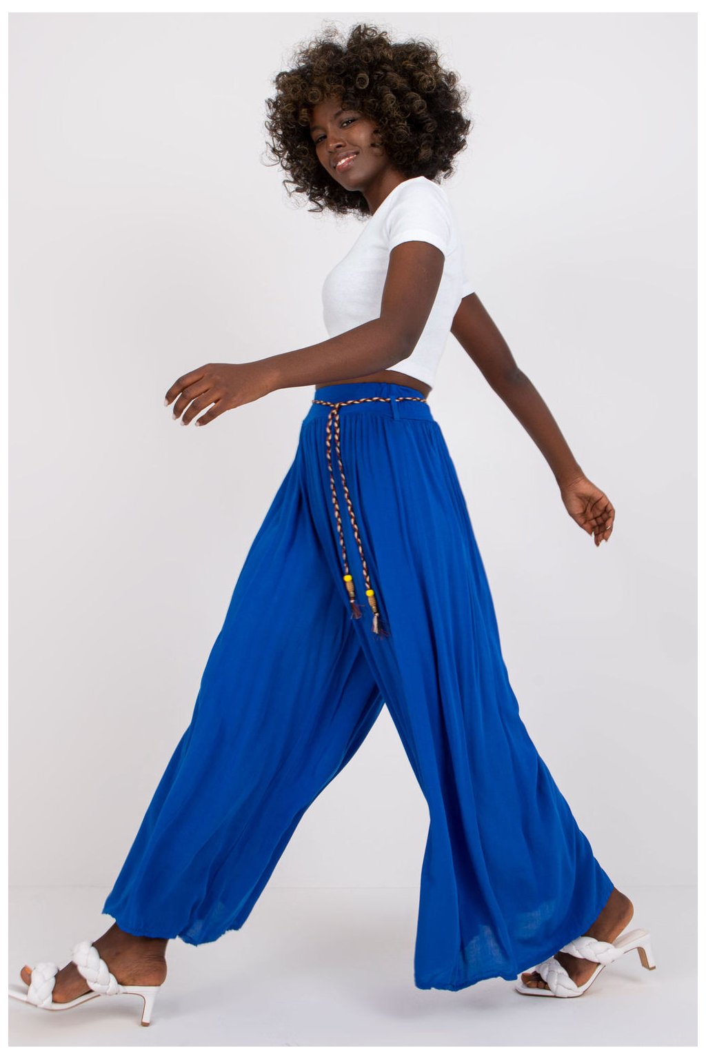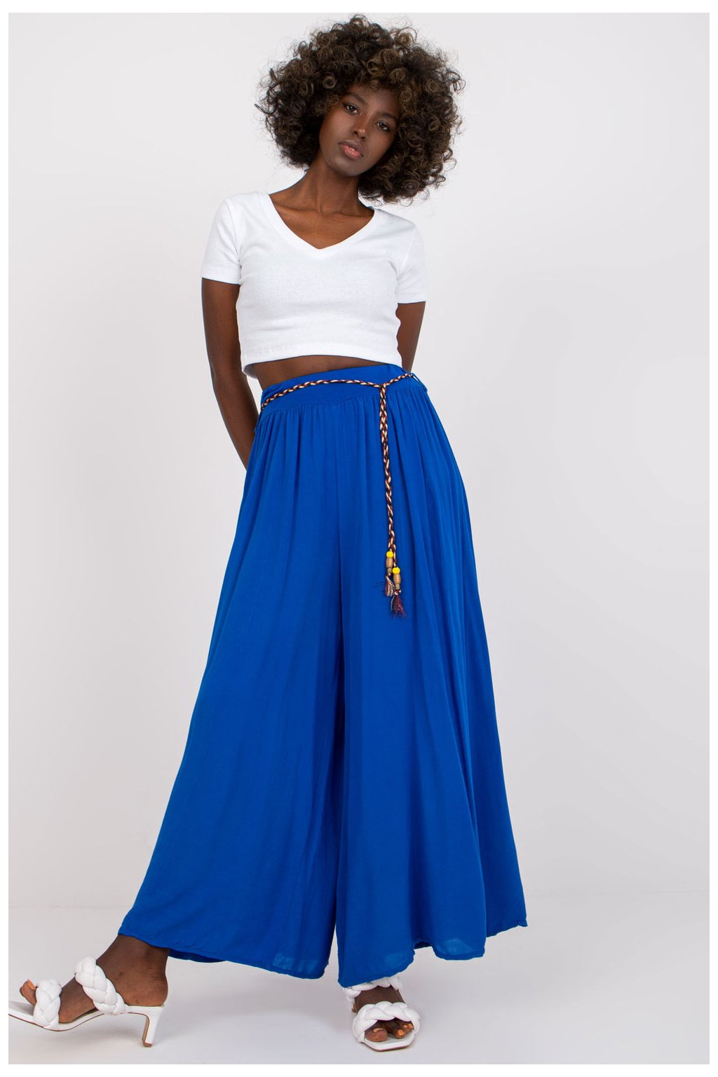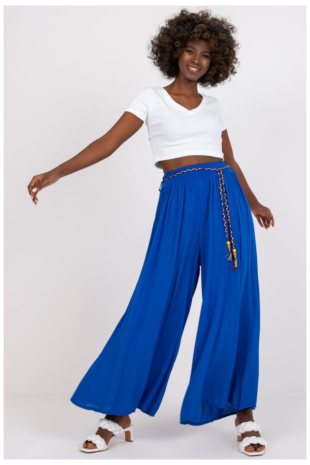Viskózové kalhoty s vysokým pasem a elastickým pasem. Kalhoty se širokými nohavicemi, ozdobný pásek na zavázání.