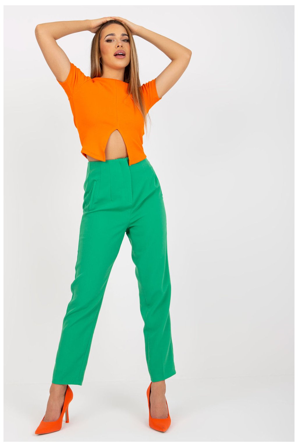 Kalhoty rovného střihu s vysokým pasem a zapínáním na zip. Imitace kapes na bocích. Ideální k různým outfitům.