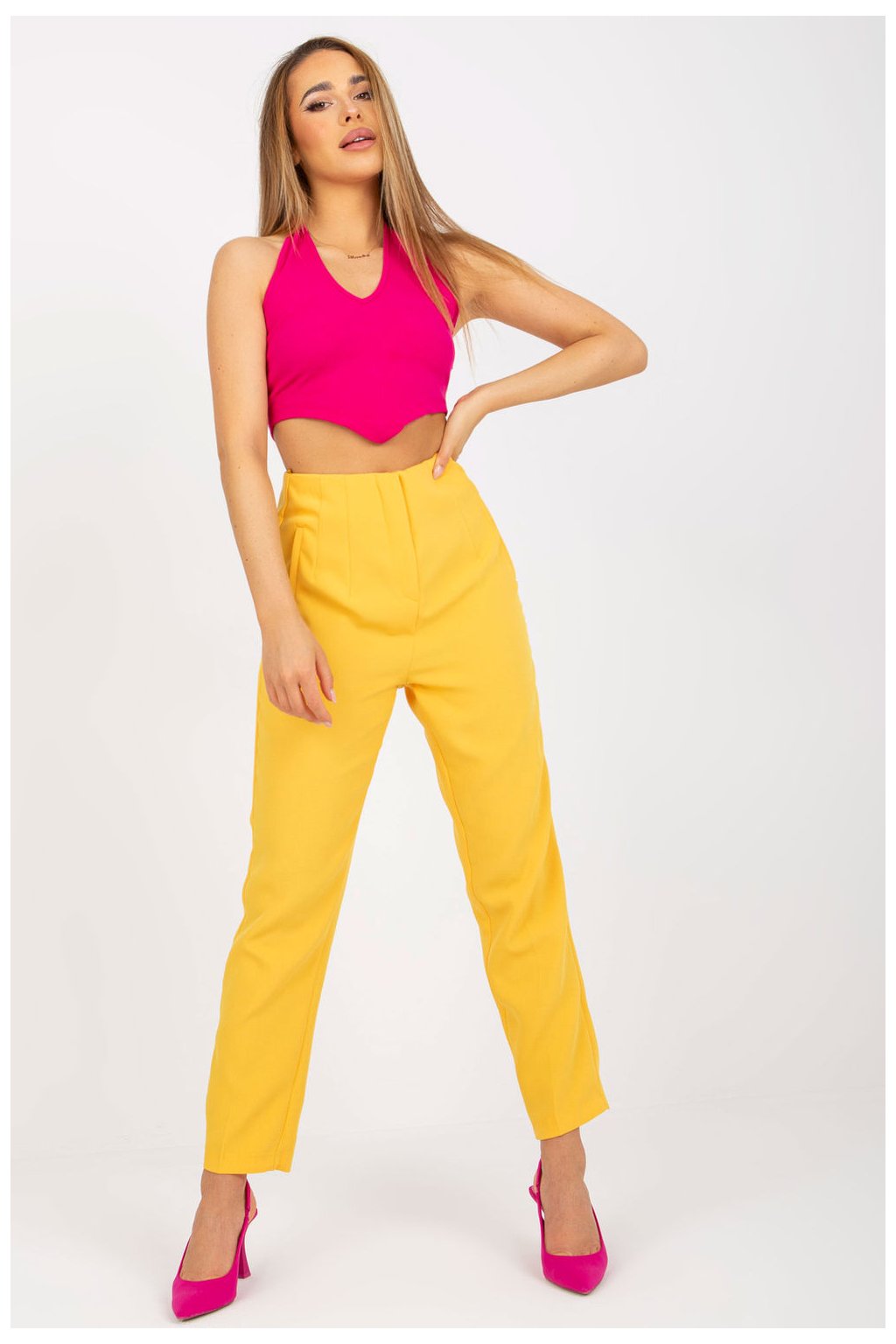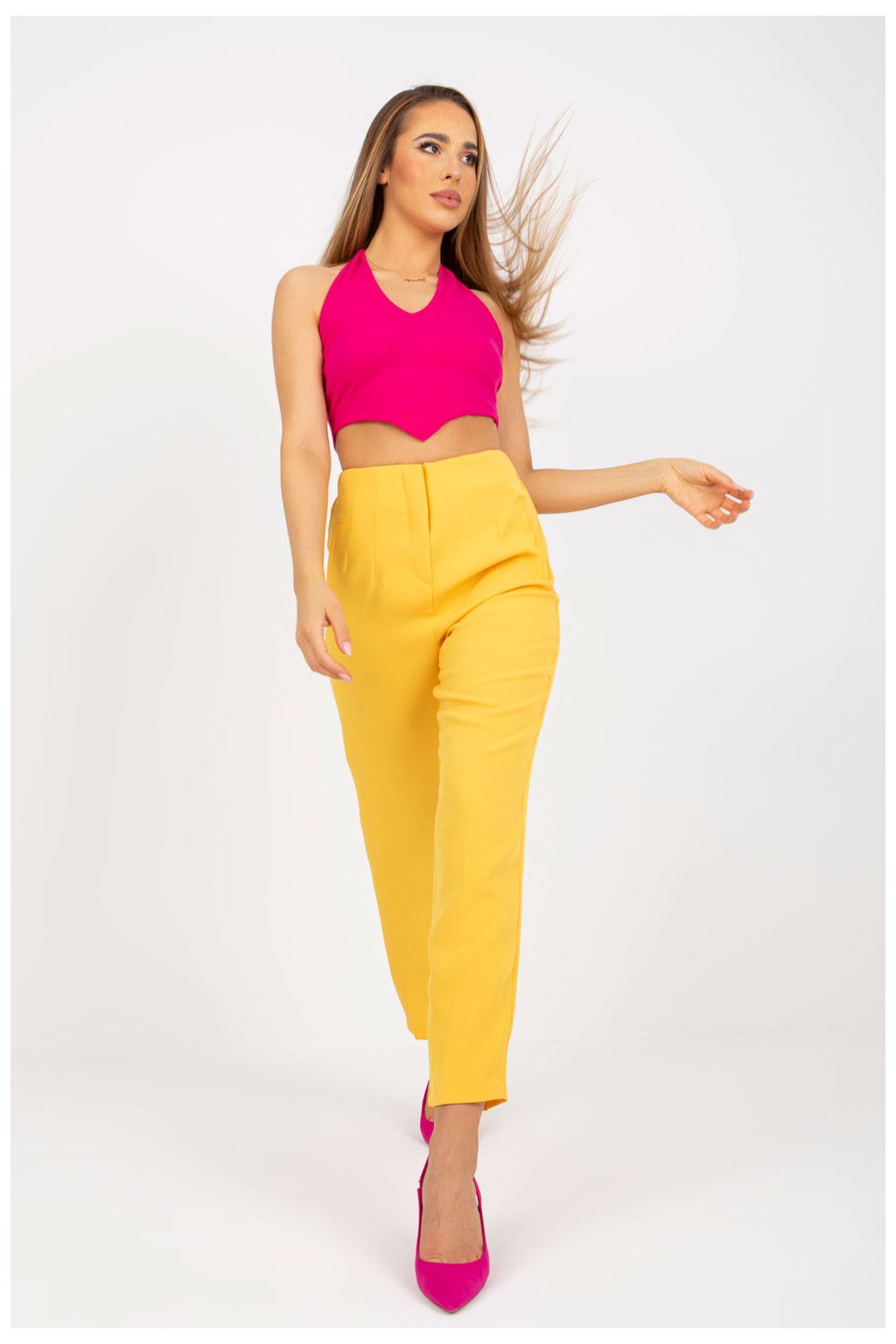 Kalhoty rovného střihu s vysokým pasem a zapínáním na zip. Imitace kapes na bocích. Ideální k různým outfitům.