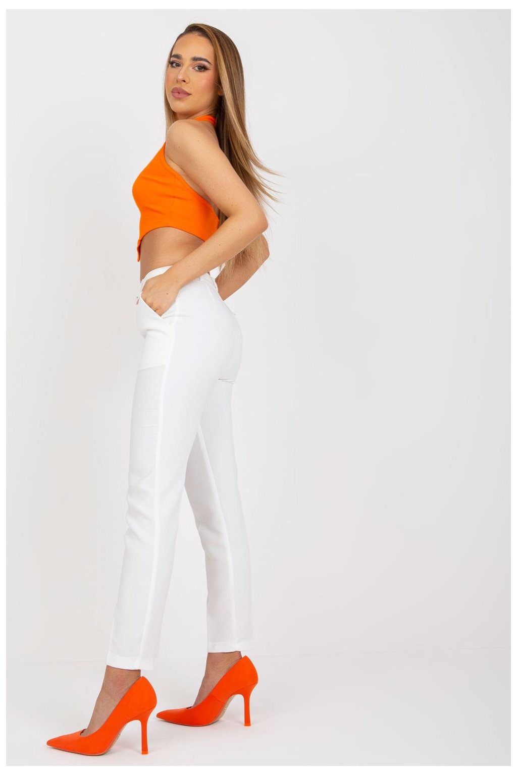 Dámské kalhoty s vysokým pasem, zúženými nohavicemi, zapínáním na knoflík a zip. Kalhoty mají na bocích kapsy a jsou doplněny páskem.