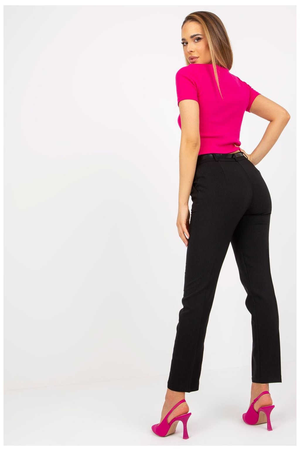 Dámské kalhoty s vysokým pasem, zúženými nohavicemi, zapínáním na knoflík a zip. Kalhoty mají na bocích kapsy a jsou doplněny páskem.