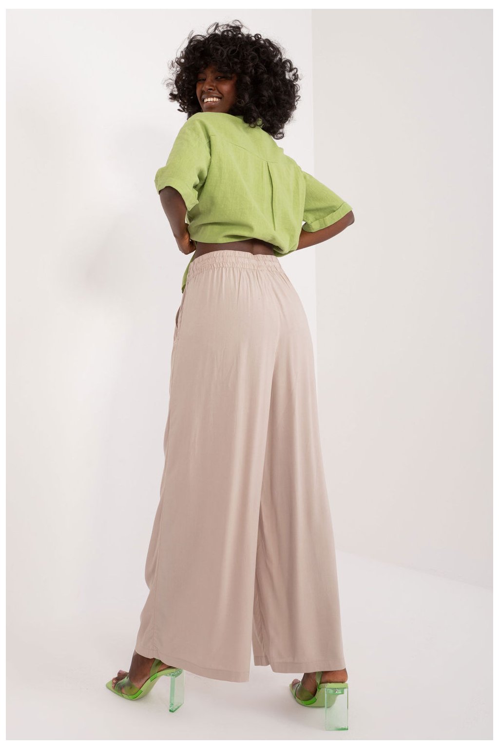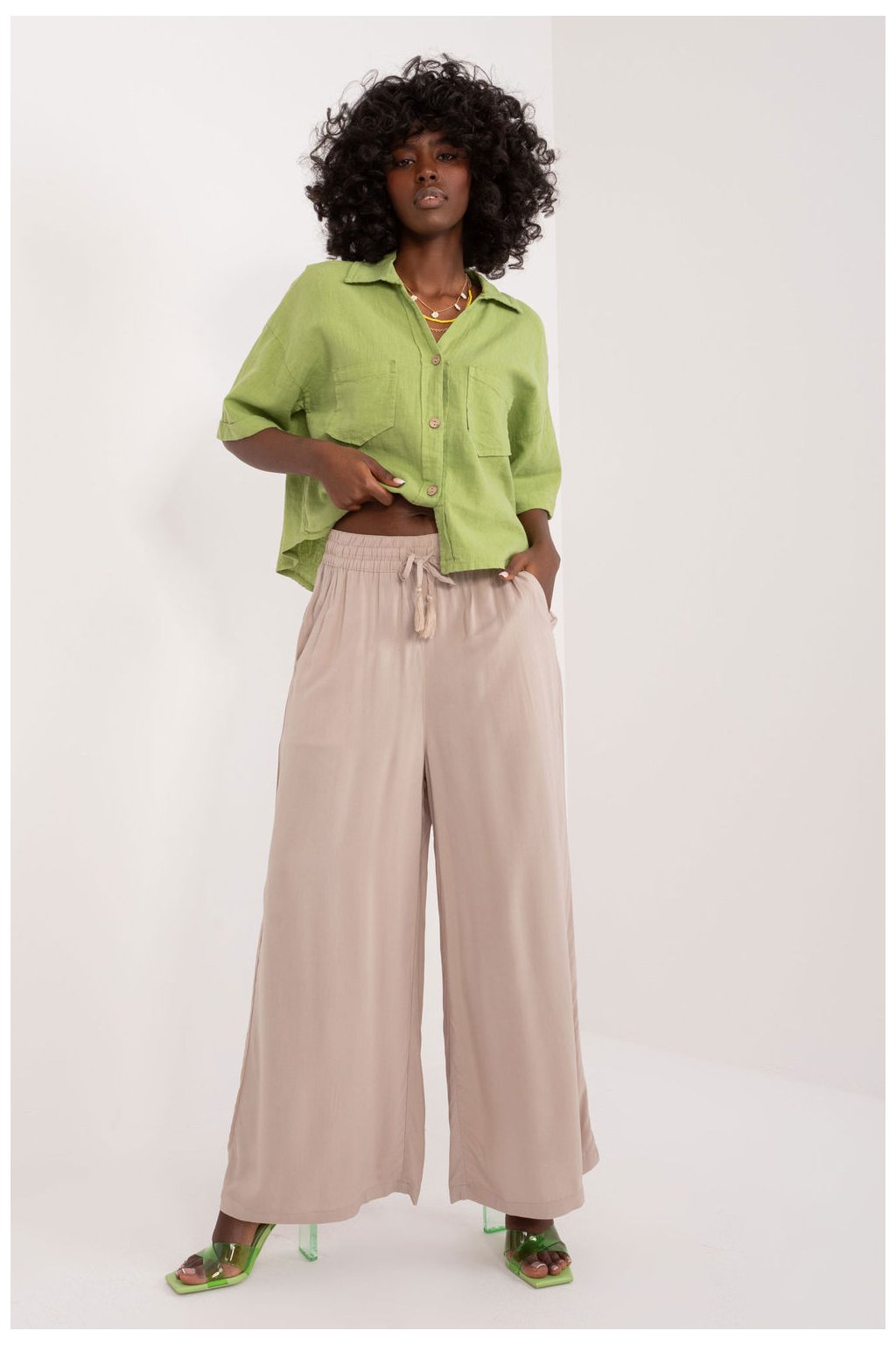Kalhoty palazzo jsou ideální volbou pro každodenní outfit, kombinující pohodlí s elegancí. Jsou vyrobeny z viskózy, která zajistí měkkost a prodyšnost, a proto se skvěle hodí jak na teplé dny, tak na chladnější večery. Široké nohavice dodávají volný a nonšalantní vzhled, který skvěle zapadá do ležérního stylu. Další výhodou jsou praktické zapichovací kapsy, které zvyšují funkčnost kalhot. Vysoký pas zdůrazňuje pas a opticky prodlužuje siluetu, což činí tyto kalhoty velmi výhodnými pro každou postavu. Šňůrky na stahování umožňují ideální přizpůsobení pasu a absence zapínání zaručuje pohodlí při nošení. Jednoduchý a jednobarevný design činí z těchto kalhot všestranný kus oblečení, který lze snadno kombinovat s různými tílky a doplňky. Jedná se o univerzální návrh pro ženy, které si cení módy a pohodlí ve svém každodenním životě.