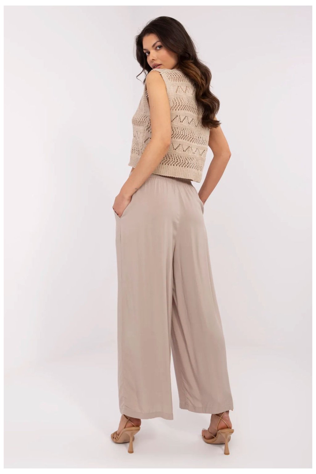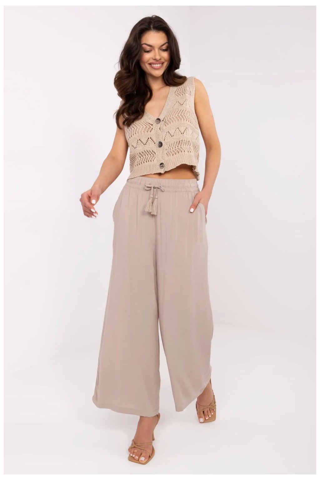 Kalhoty palazzo jsou ideální volbou pro každodenní stylizace, spojující pohodlí s elegancí. Vyrobené z viskózy, která poskytuje měkkost a prodyšnost, se skvěle hodí jak na teplejší dny, tak i na chladnější večery. Široké nohavice jim dodávají volný, nonšalantní vzhled, který skvěle zapadá do ležérního stylu. Další výhodou jsou praktické vložené kapsy, které zvyšují funkčnost kalhot. Vysoký pas zdůrazňuje pas a opticky prodlužuje siluetu, což znamená, že tyto kalhoty jsou velmi výhodné pro každou postavu. Šňůrky na stahování umožňují ideální přizpůsobení pasu a absenci zapínání zaručuje pohodlí při nošení. Jednoduchý, jednolitý design činí tyto kalhoty všestranným prvkem šatníku, který lze snadno kombinovat s různými topy a doplňky. Jedná se o univerzální nabídku pro ženy, které si cení módy a pohodlí každý den.