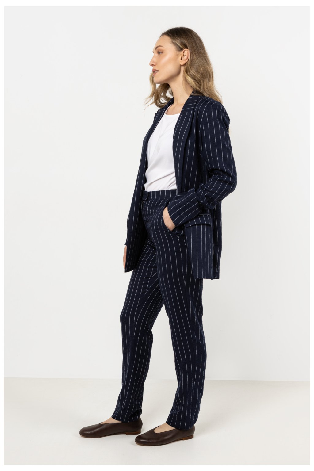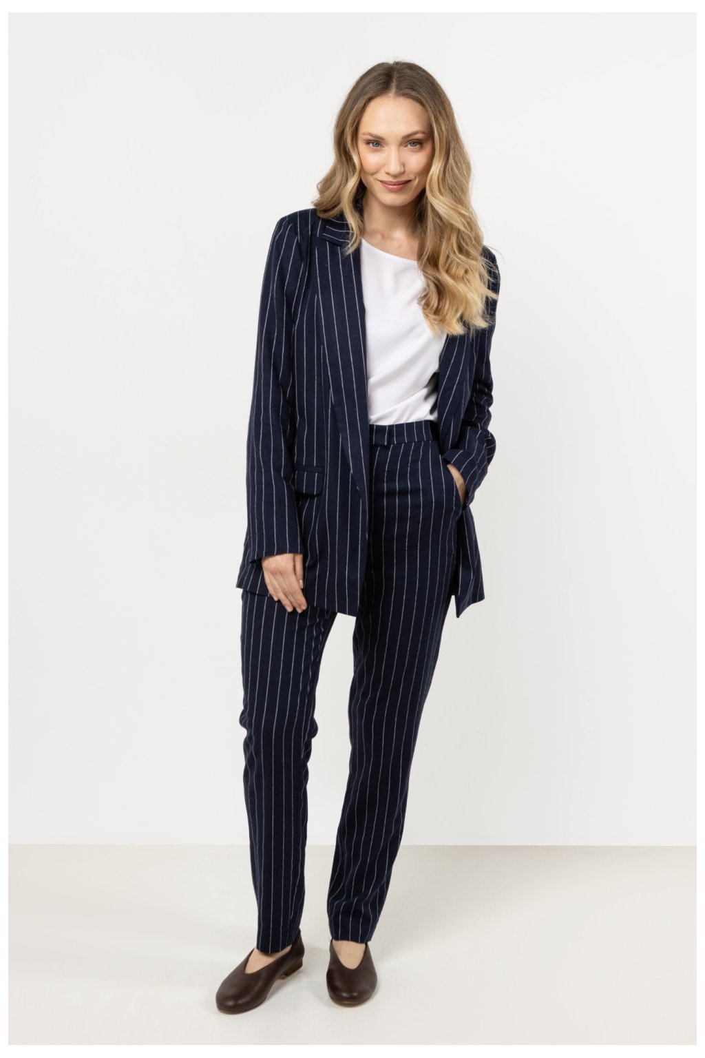 Lněné kalhoty cigaretového střihu s pruhy Tyto kalhoty jsou ideální kombinací stylu a pohodlí. Zúžený střih jemně zvýrazňuje siluetu a prodyšný len zajišťuje celodenní komfort. Zapínání na knoflík a zip jim dodává eleganci, zatímco jemné pruhy je činí vhodnými jak pro každodenní, tak pro formální stylizace. Spojte lněné kalhoty s vestou nebo sako ze stejné tkaniny a vytvoříte elegantní letní vzhled.
